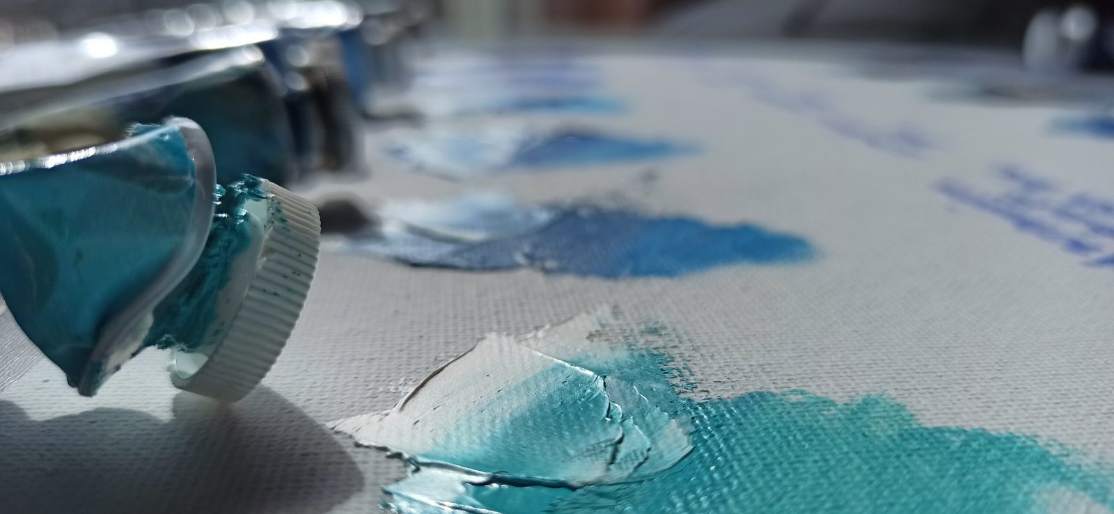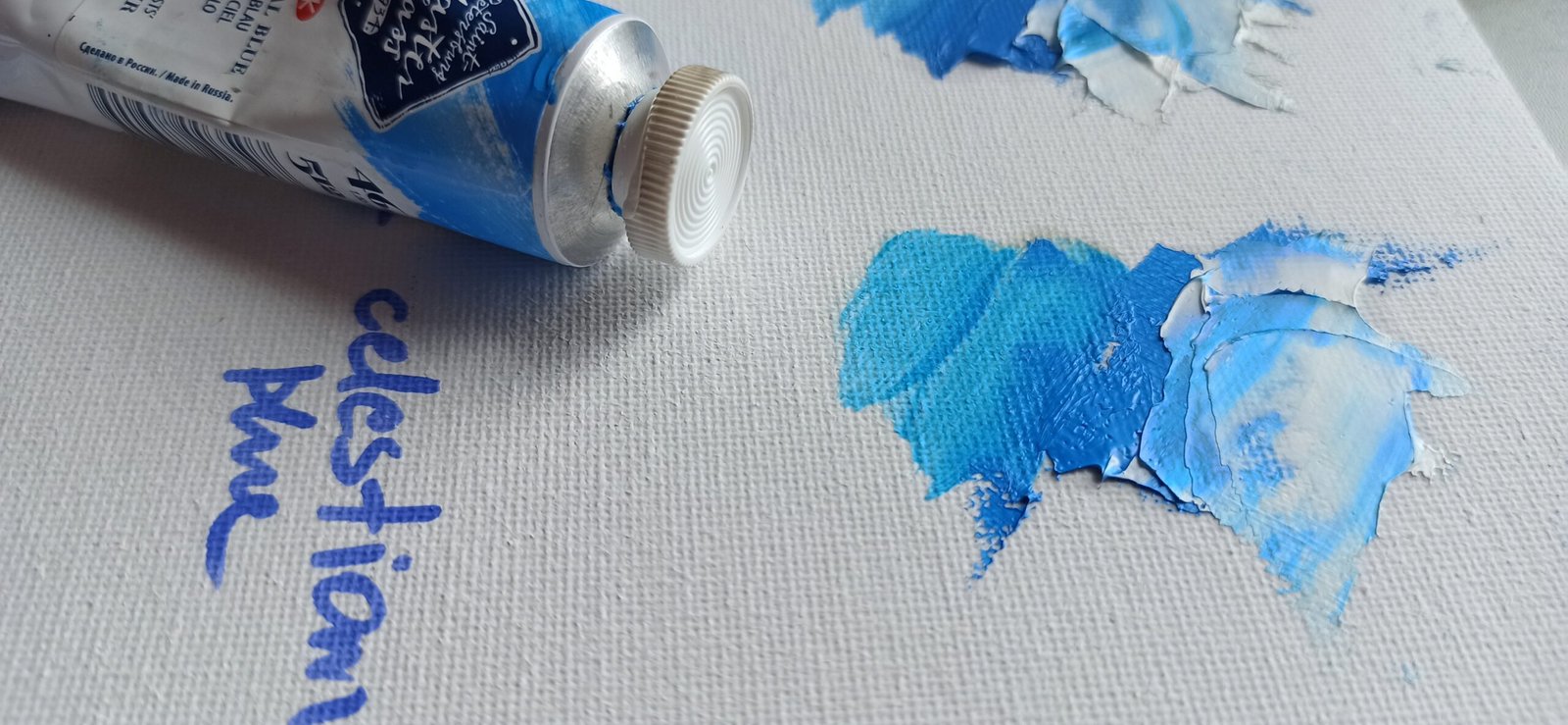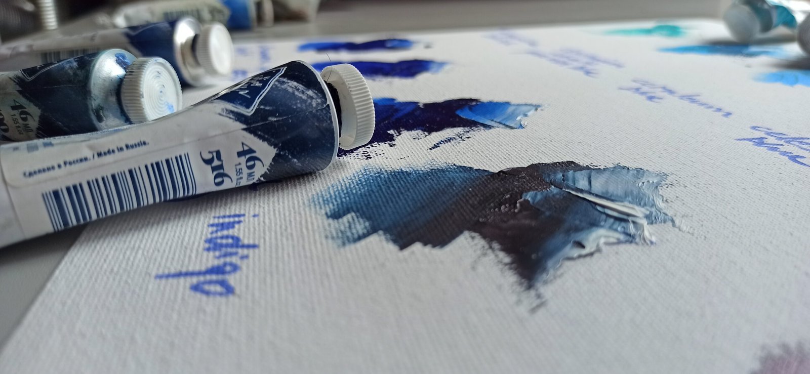 Šiandien nusprendžiau išrūšiuoti savo dažus :). Mėlyni ir žydri atspalviai. O savo tapyboje naudoju vos kelis iš jų. Labai praktiška pasidaryti turimų dažų spalvininką. Vienoje pusėje dažas skiestas aliejinių dažų priedu „Liquin“, kitoje- titanium white. Spalvininkas padeda lengvai rasti tinkamą spalvą tapybos proceso metu.