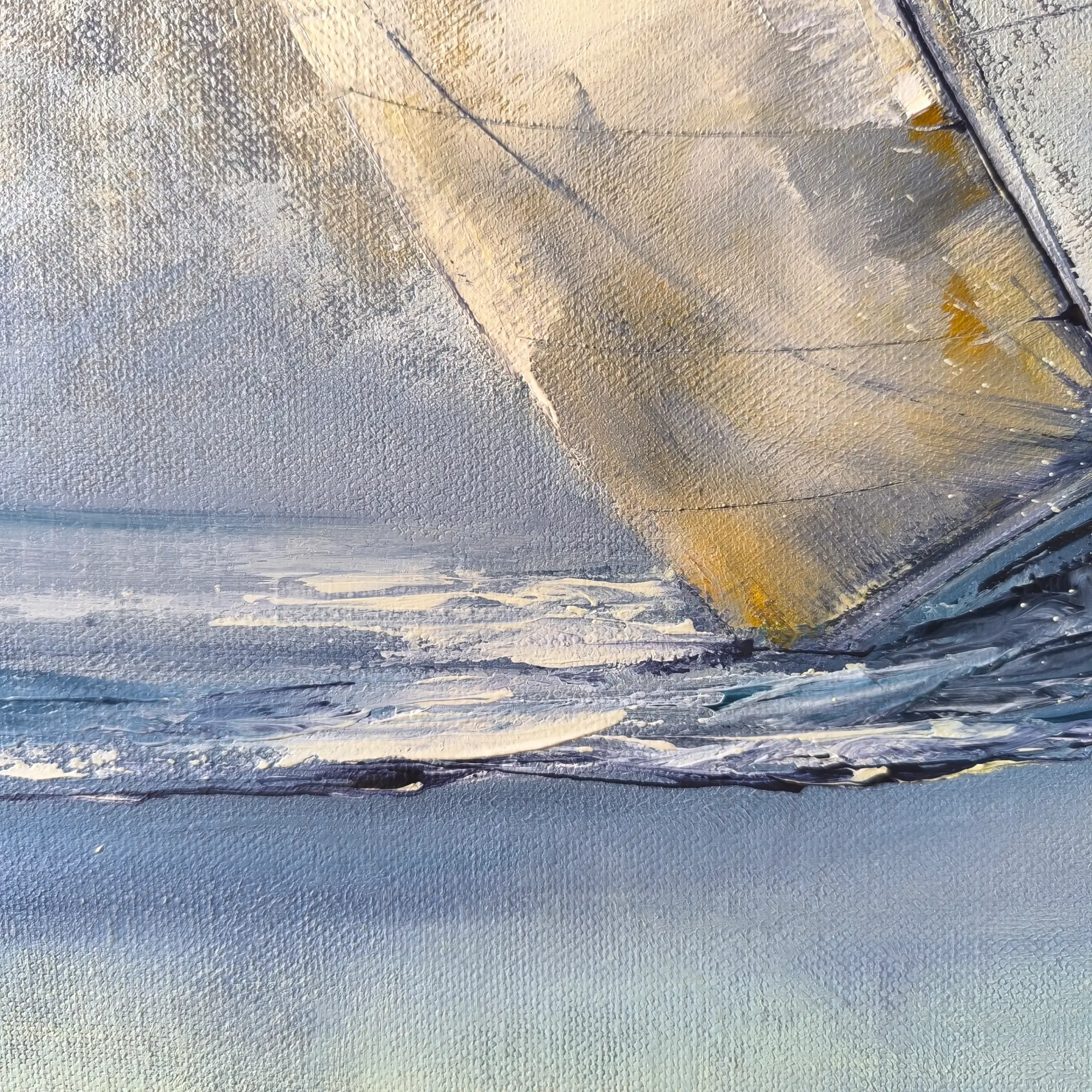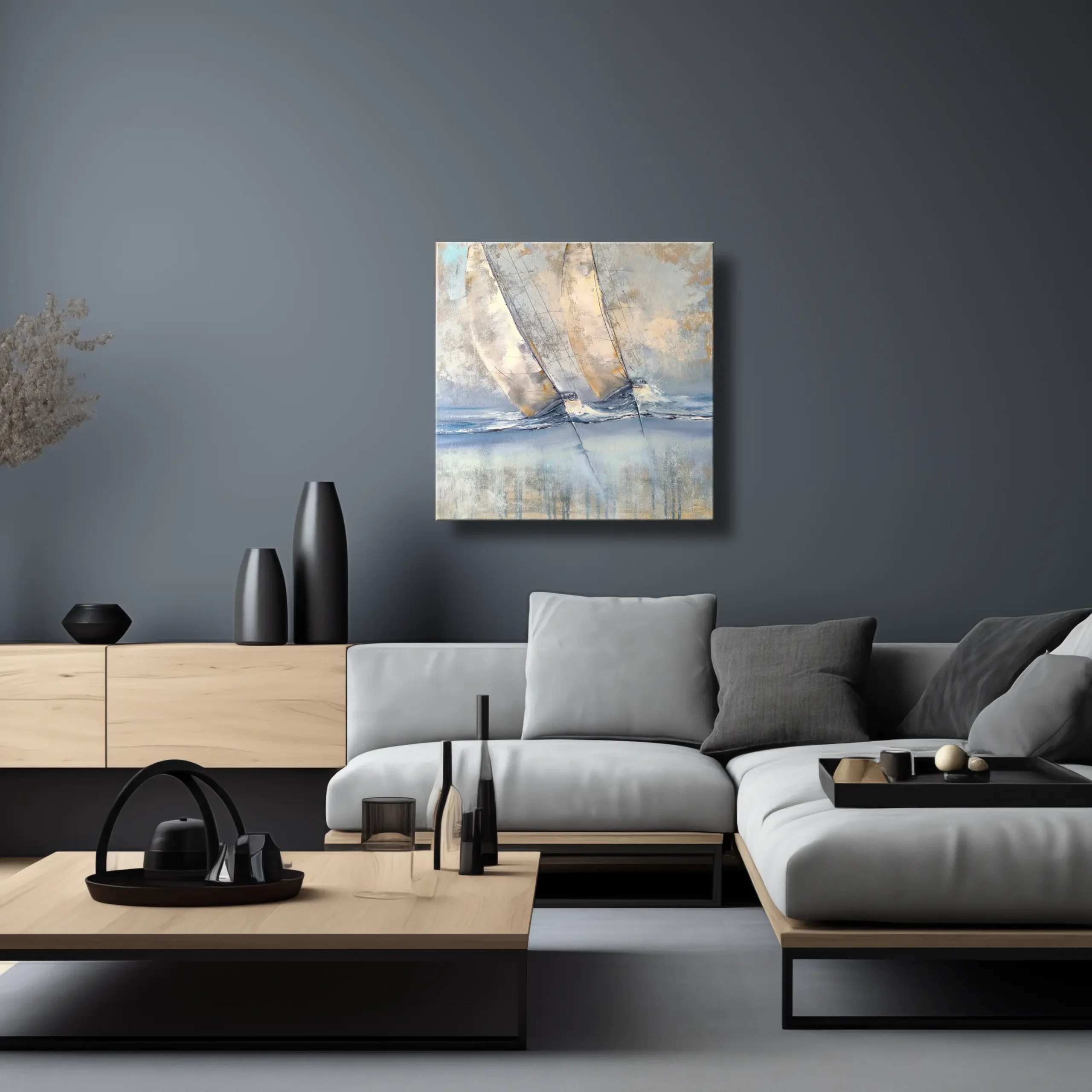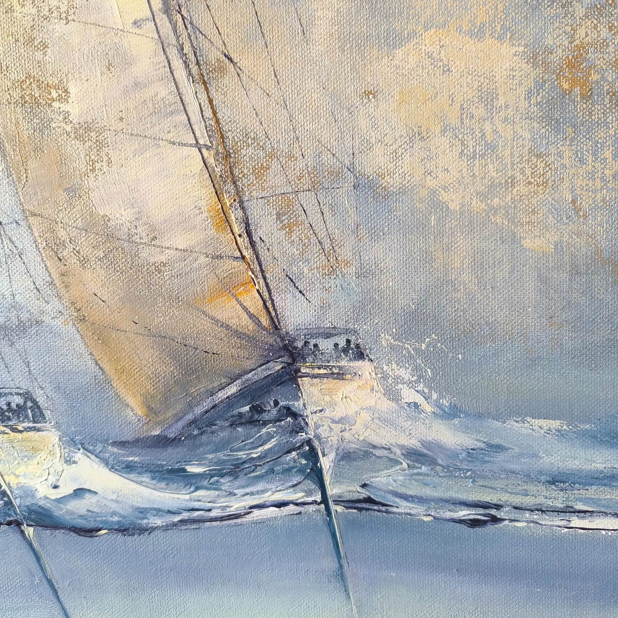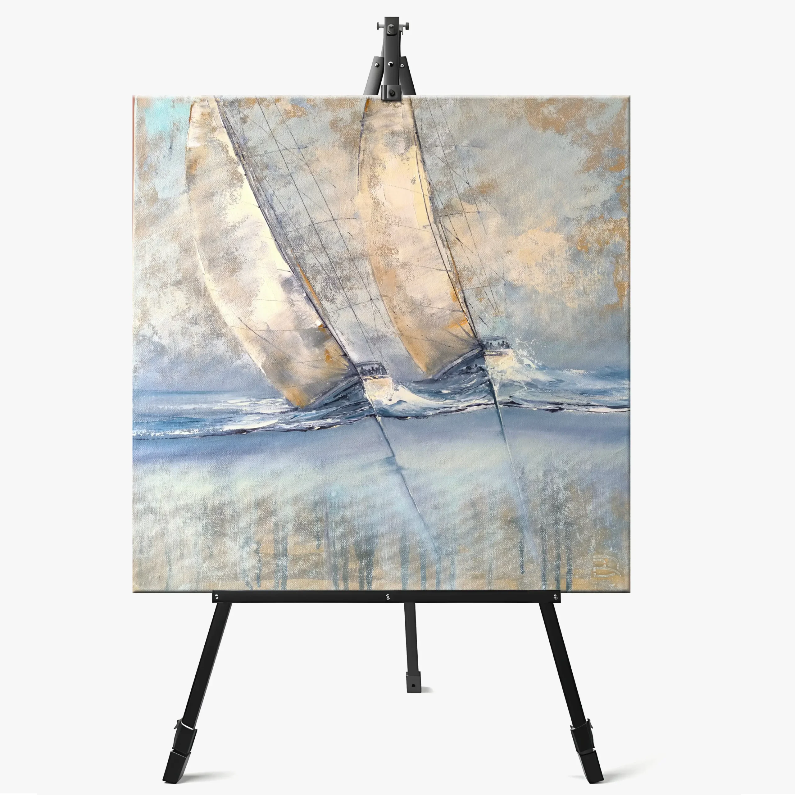 Šis dviejų jachtų skrodžiančių bangas paveikslas ant drobės puikiai dera moderniame, minimalistiniame ar skandinaviškame interjere. Švelnūs pilkšvi, smėlio ir melsvi tonai suteikia lengvumo ir elegancijos pojūtį.