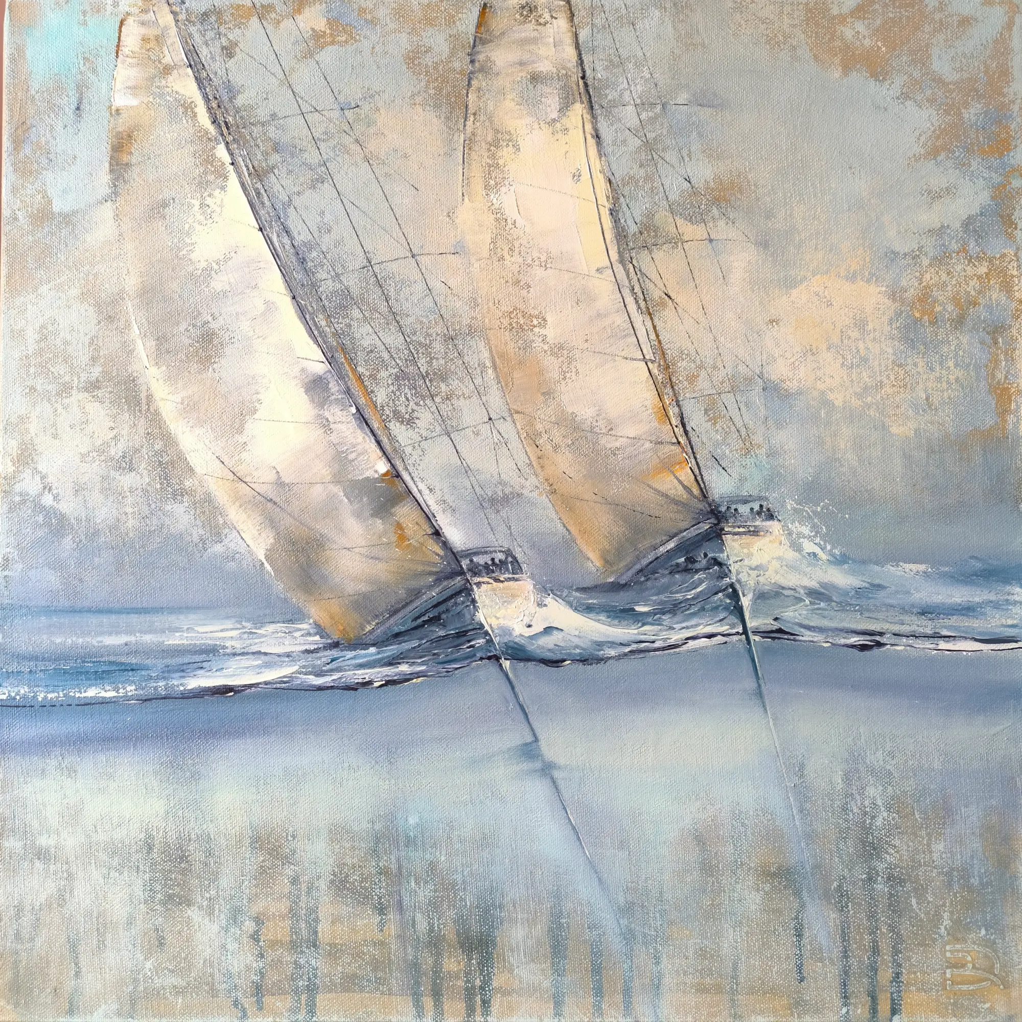 „Du, tai jau komanda“ – tai subtilus, modernus paveikslas, kuriame vaizduojamos dvi jachtos, skrodžiančios bangas ta pačia kryptimi. Lengvi, dinamiški potėpiai ir švelni spalvų paletė sukuria harmonijos, judėjimo ir bendrystės jausmą.