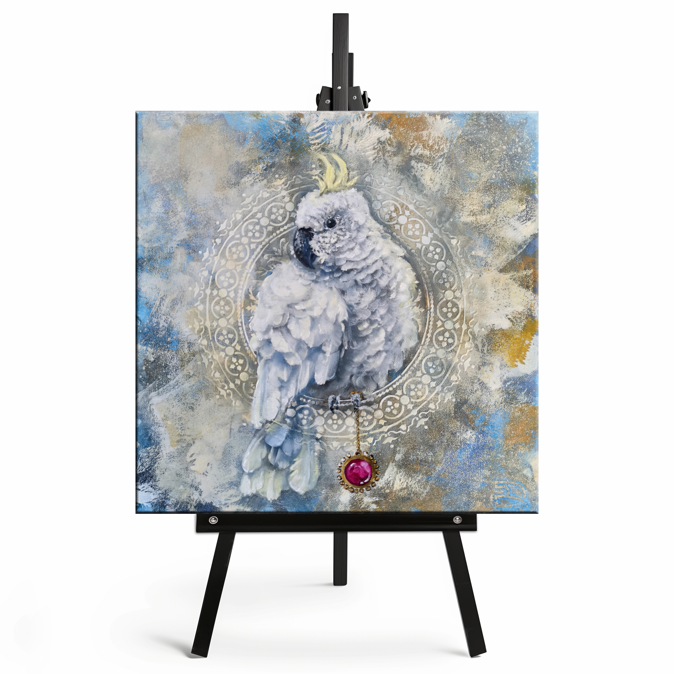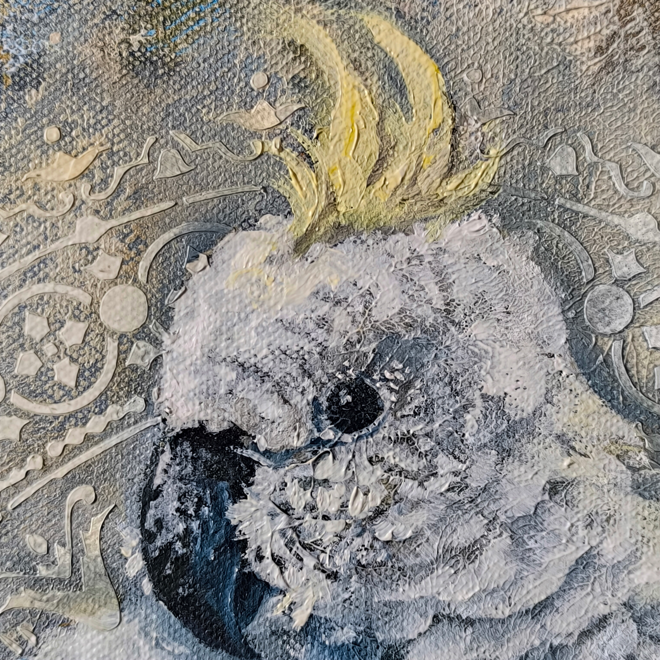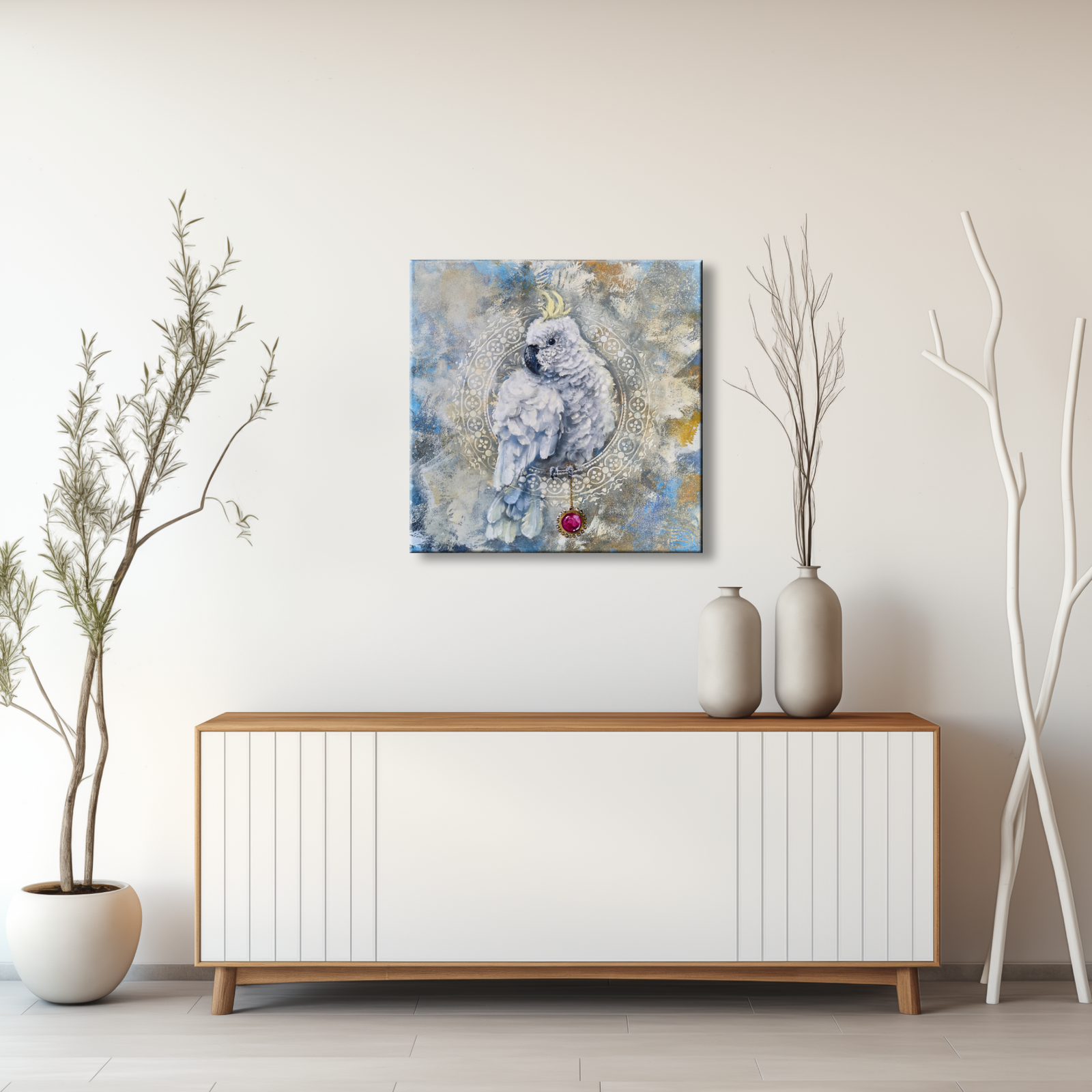 „Namų princesė“ – tai paveikslas, kuriame dera grožis, žaismingumas ir subtilumas. Švelniai nutapyta papūga tarsi sustingusi akimirkoje – jos lengva siluetas išryškėja mandalos fone, primenančiame laiko tėkmę ir vidinę ramybę.