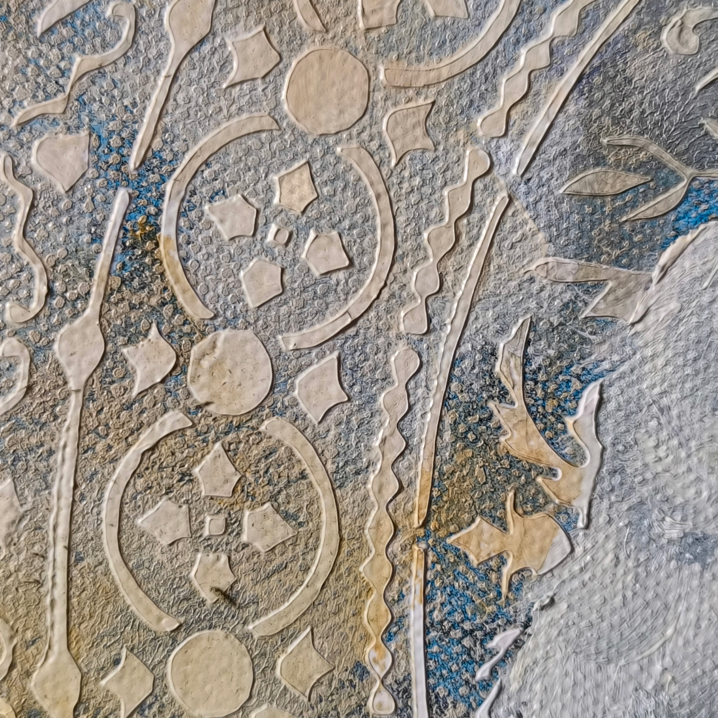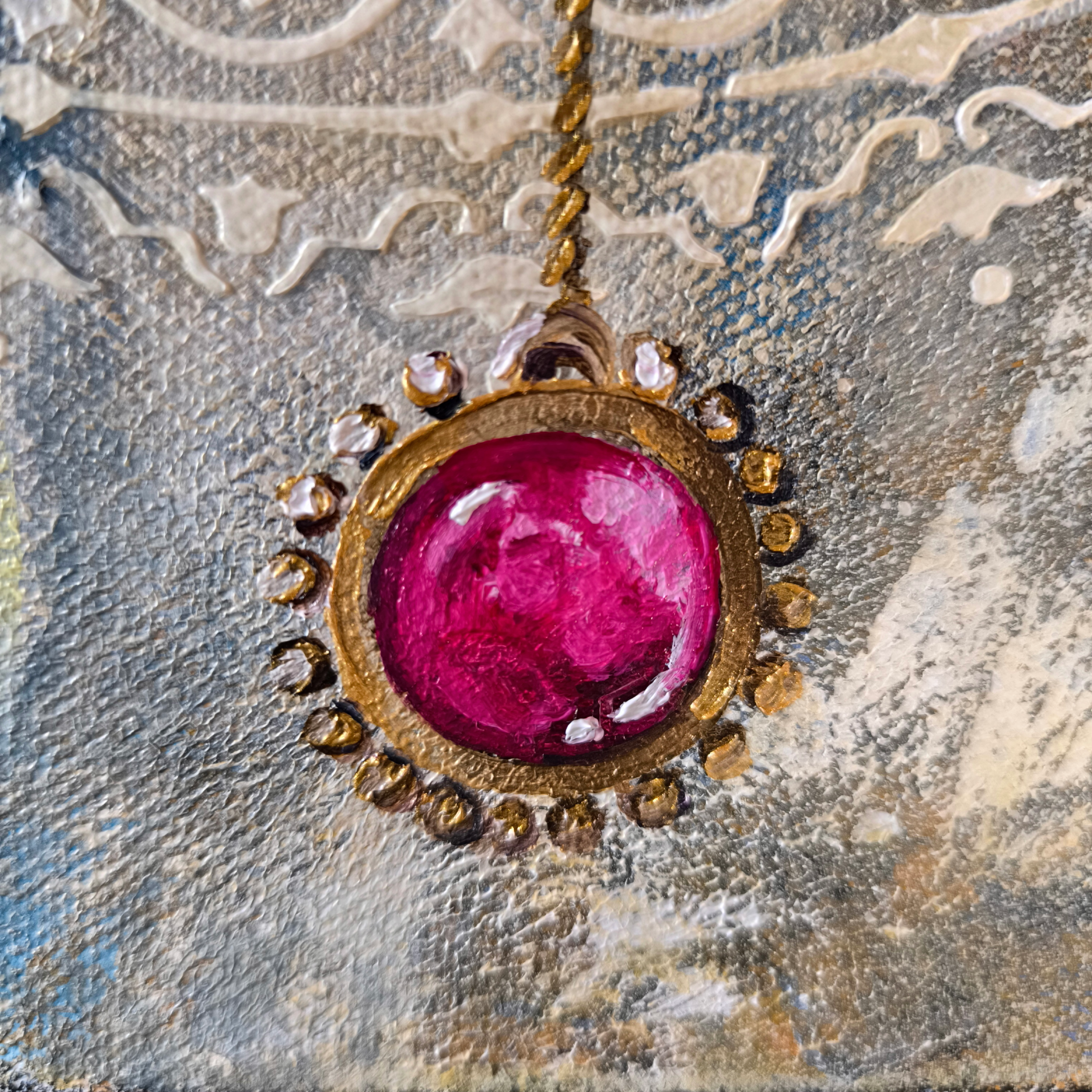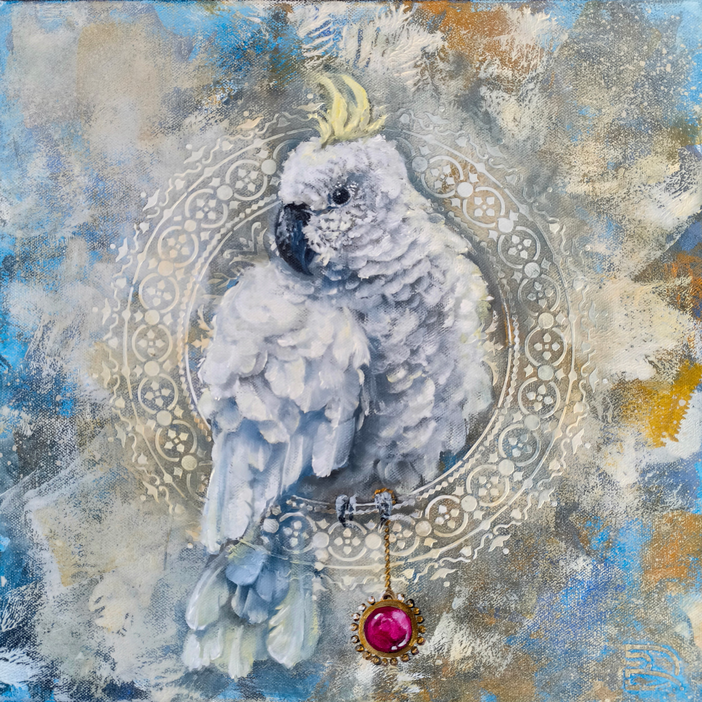 „Namų princesė“ – tai paveikslas, kuriame dera grožis, žaismingumas ir subtilumas. Švelniai nutapyta papūga tarsi sustingusi akimirkoje – jos lengva siluetas išryškėja mandalos fone, primenančiame laiko tėkmę ir vidinę ramybę.