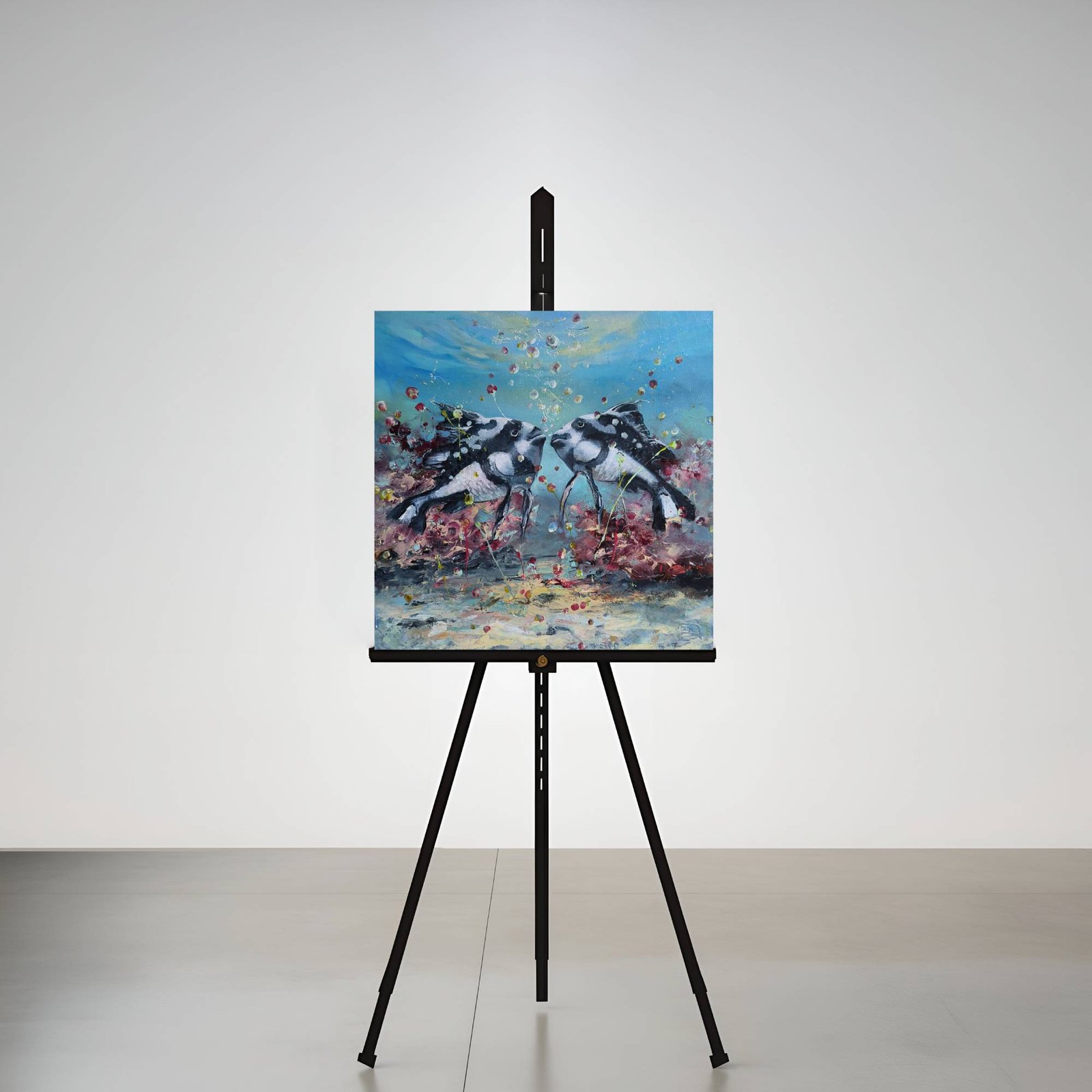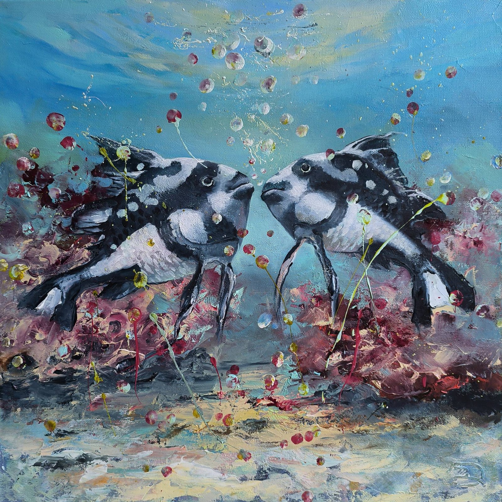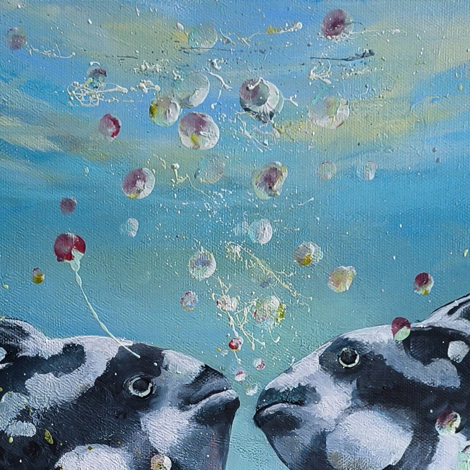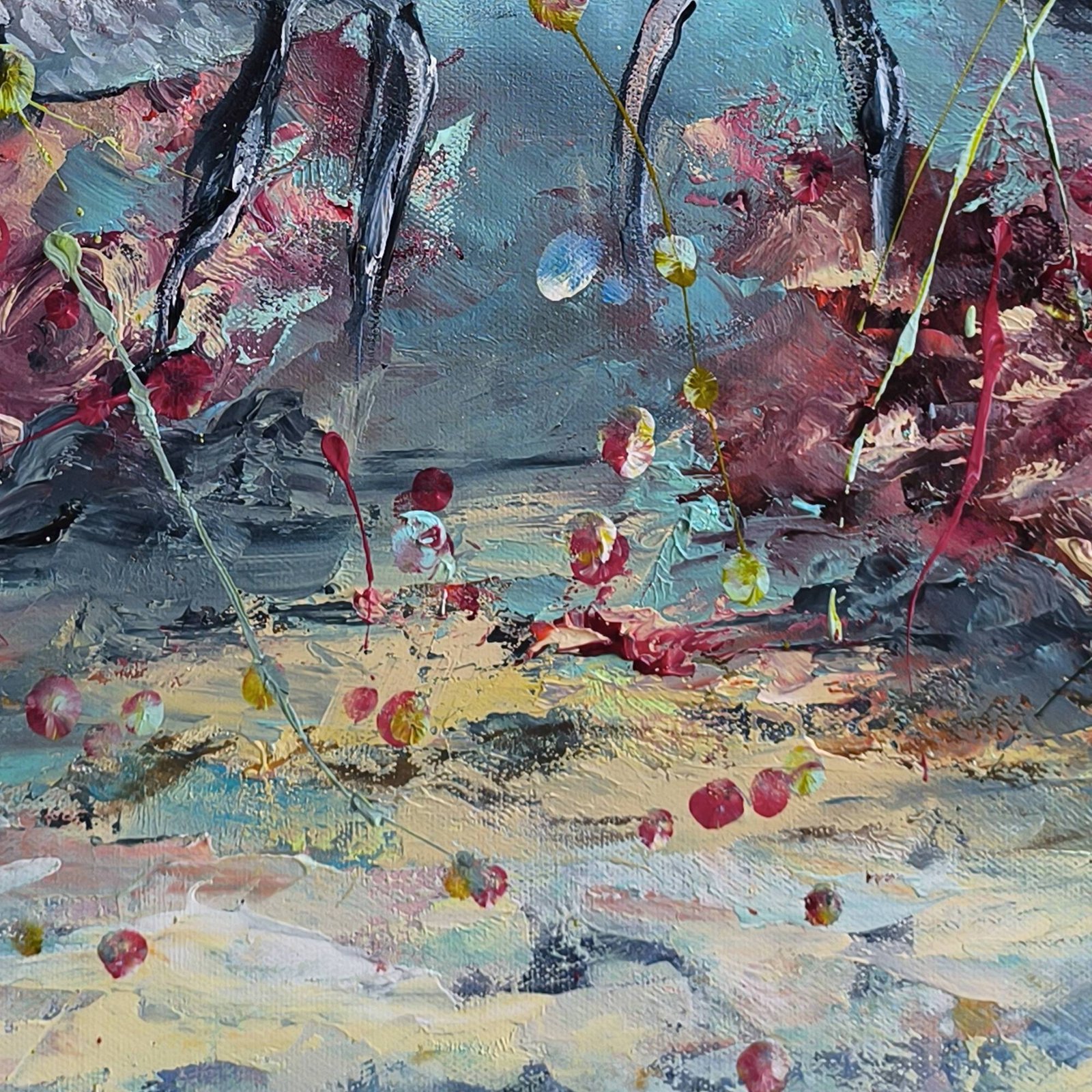 Paveikslas „PRIEŠINGYBĖS TRAUKIA” 2024m Daiva Rožukienė. Paveikslo matmenys 50cm/50cm 3,5 cm, medinis porėmis. Mišri technika: akrilas, aliejus. Facebook.