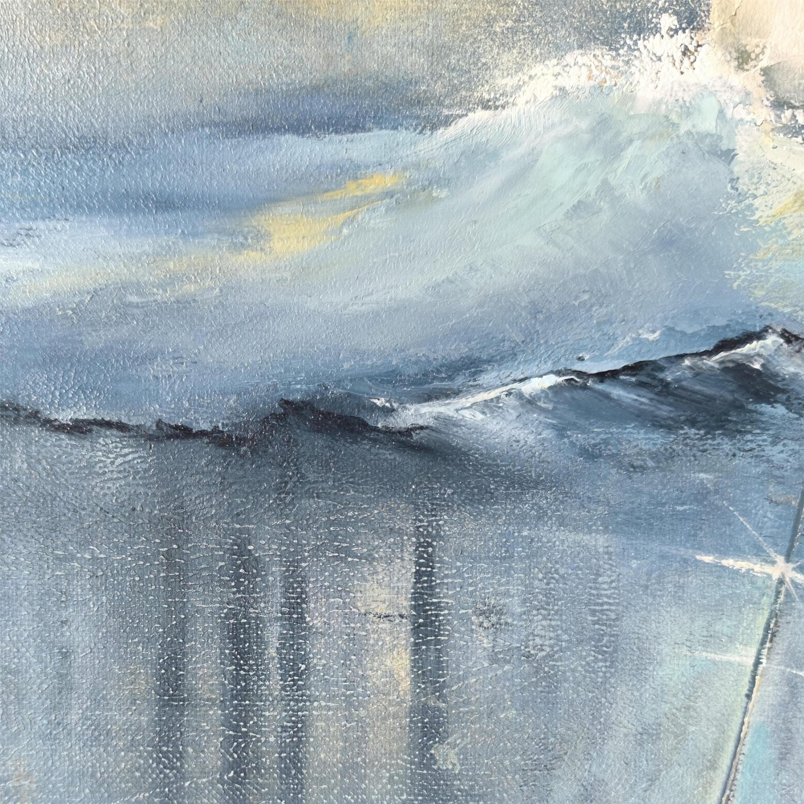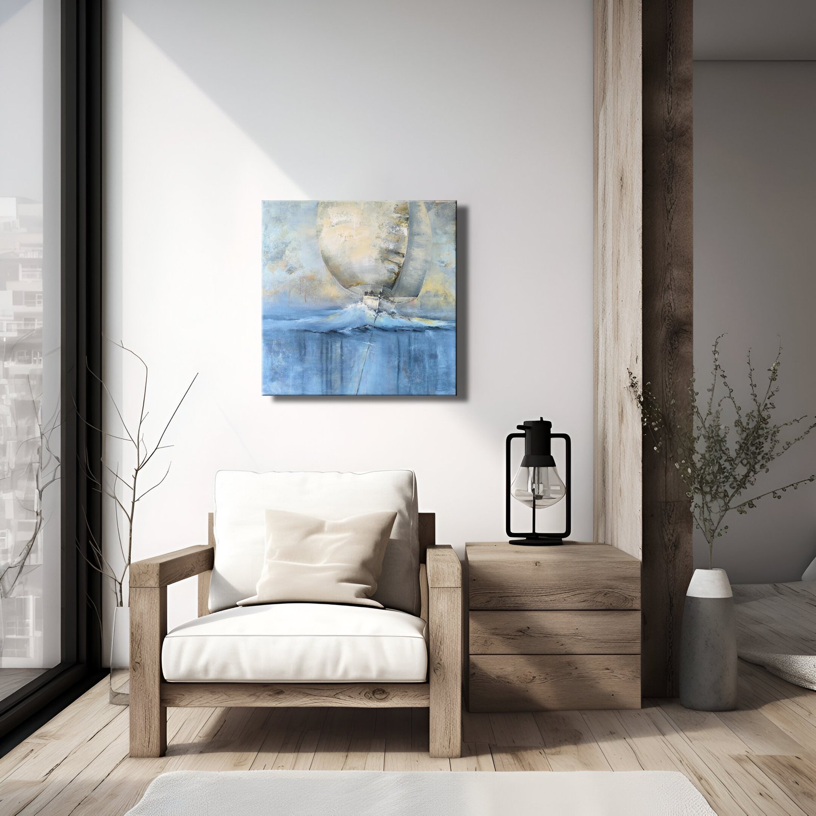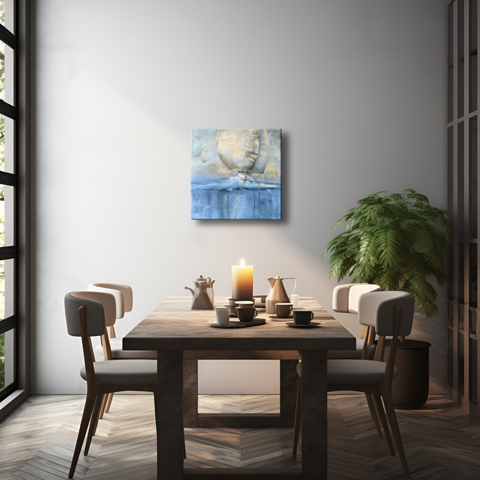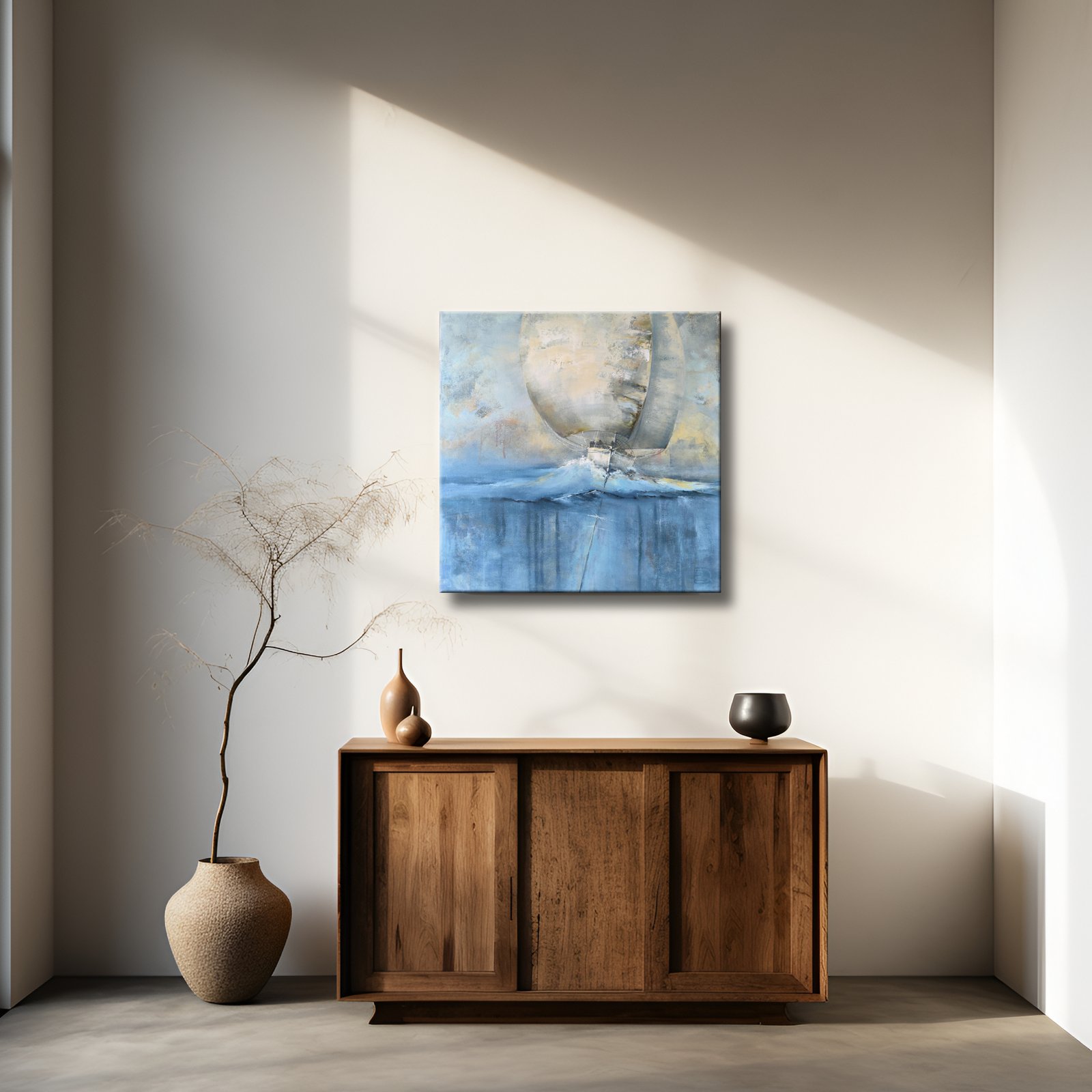 Kūrinys jungia spalvų jėgą ir tekstūrų ekspresiją: burlaivis ant skaidrios bangos, kylis po vandeniu sujungia gelmes su dangumi. Tai paveikslas apie judėjimą, drąsą ir laisvę, kur potėpiai atkuria bangų ritmą ir kelionės jėgą pirmyn