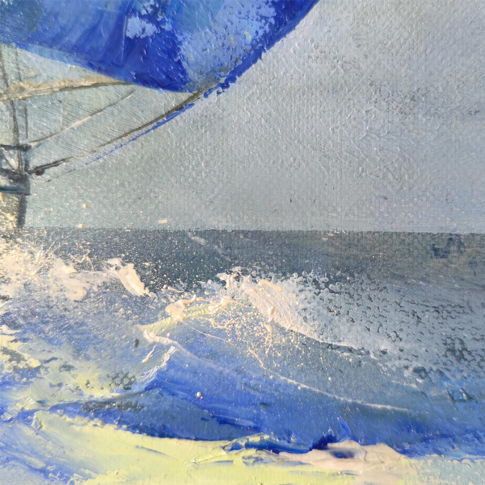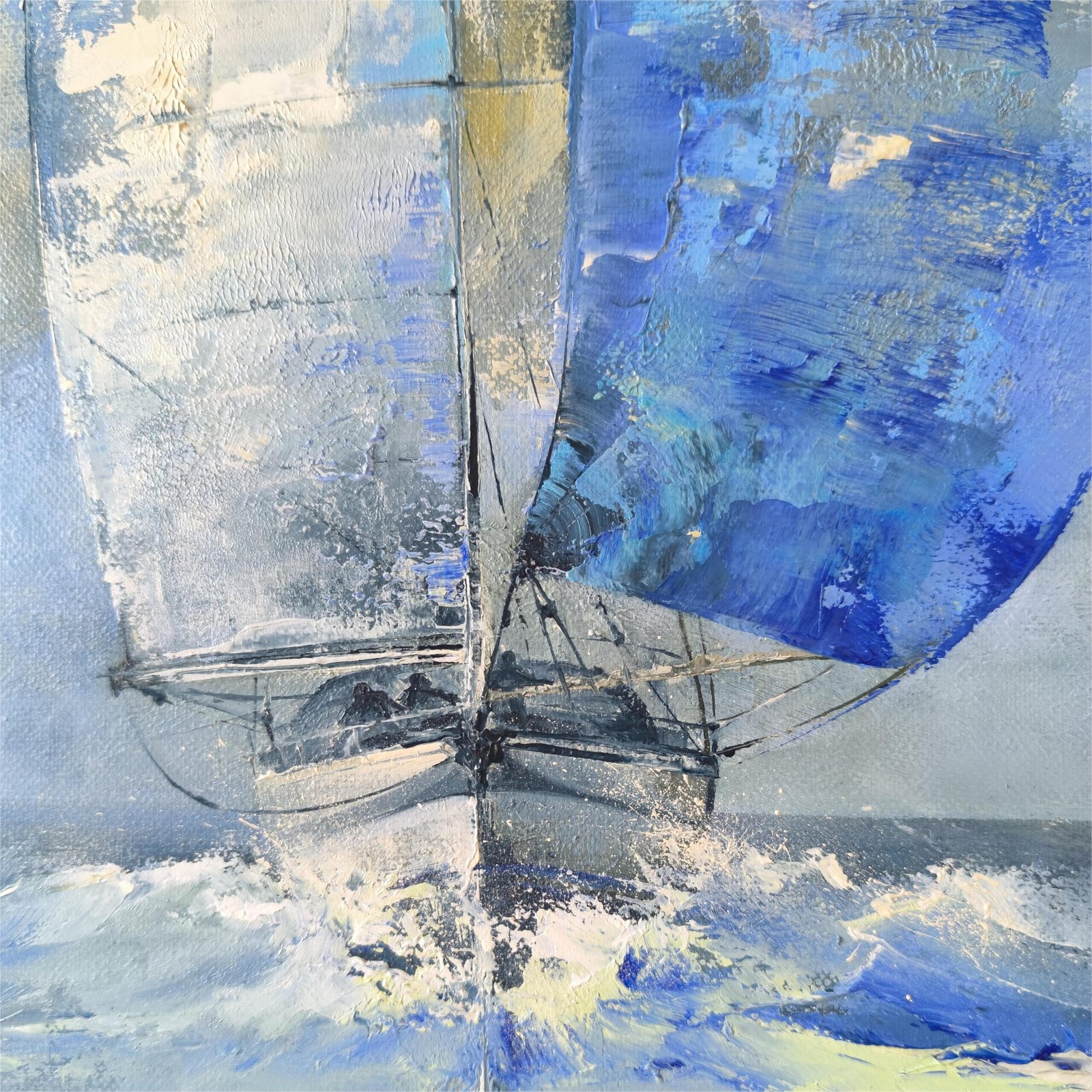 Šiuolaikinis, marinistinis paveikslas su laivu „PAGAUTI VĖJĄ”, matmenys 50x50x3,5cm.
