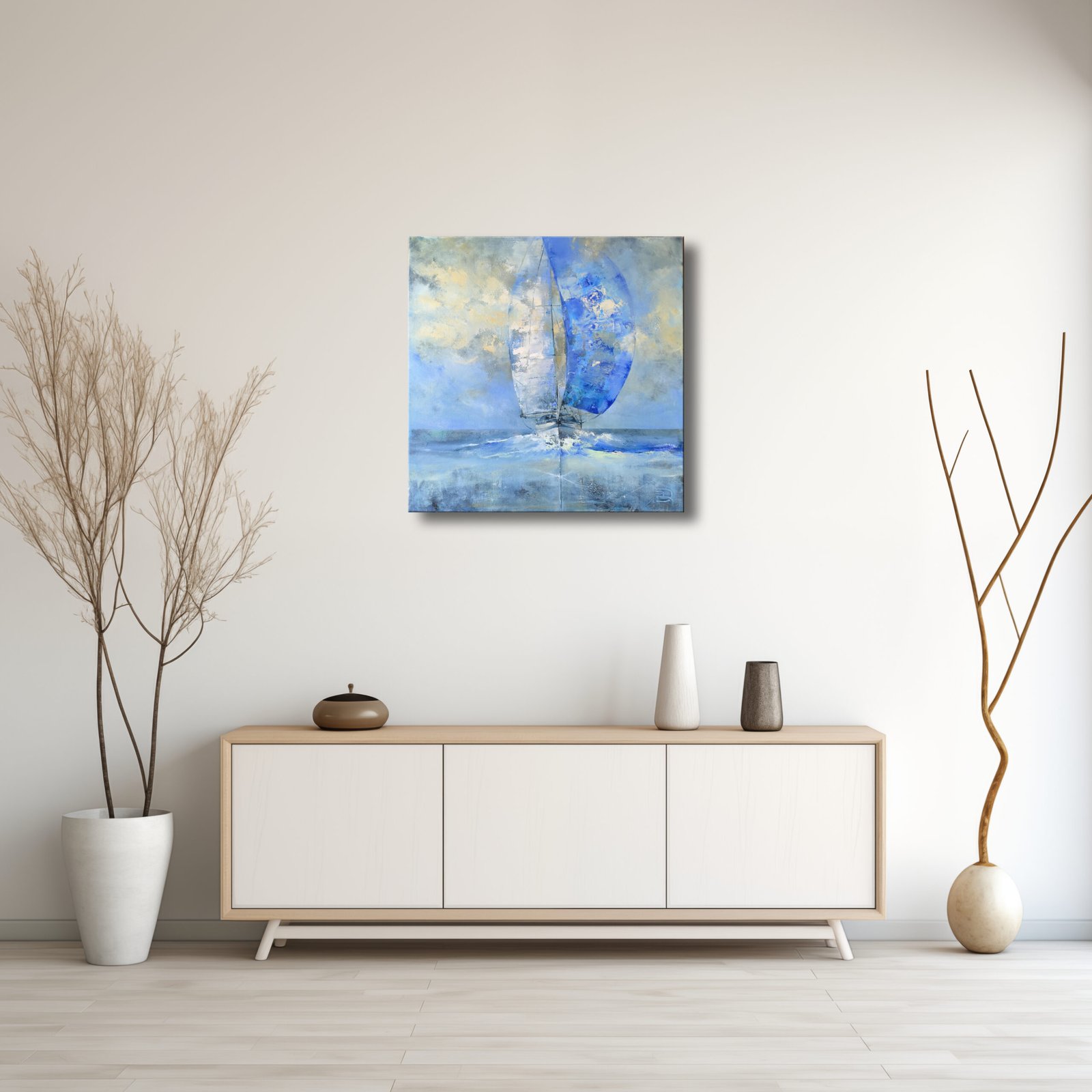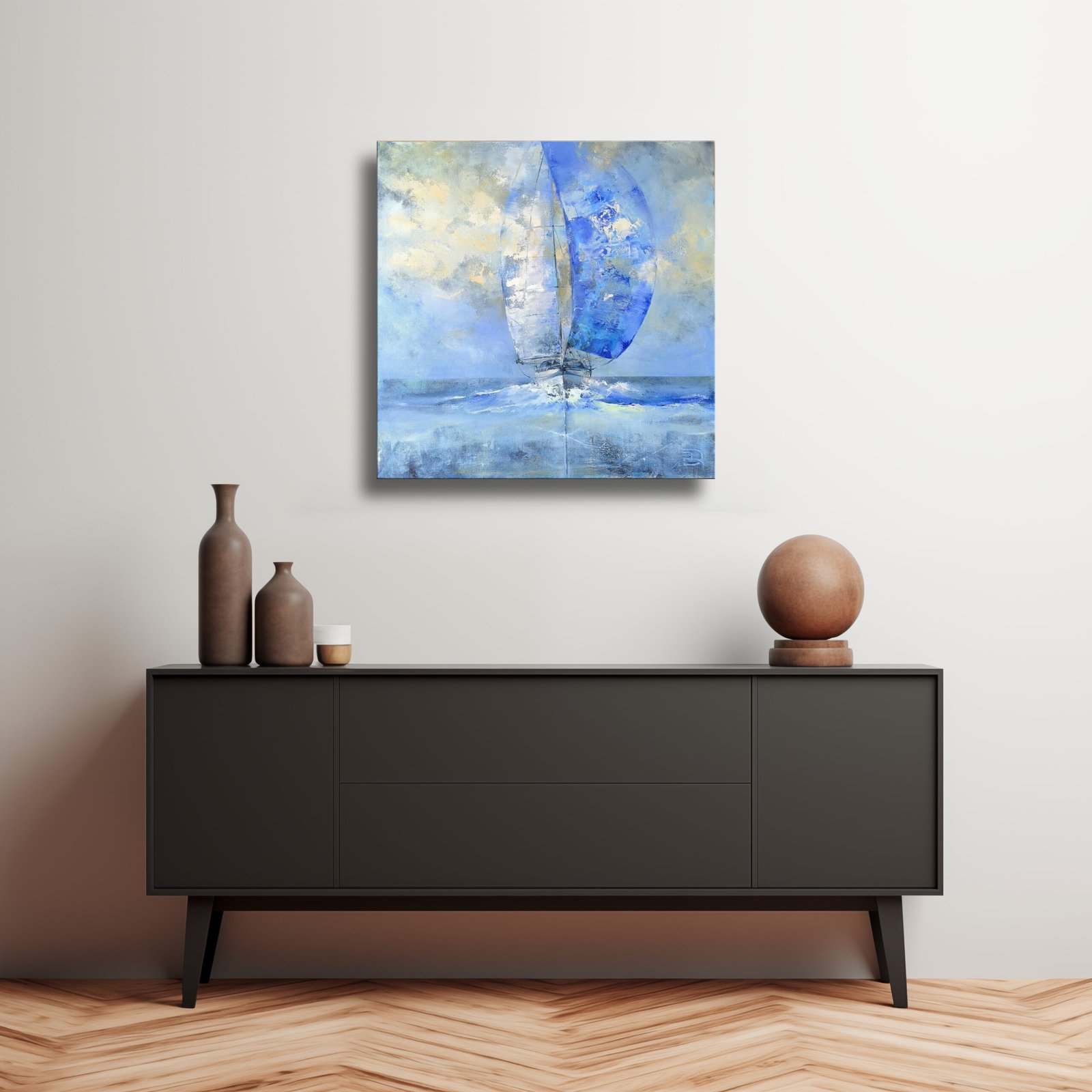Šis paveikslas su burlaiviu „Pagauti vėją“ sukurtas ant kokybiškos drobės, naudojant profesionalius akrilinius bei aliejinius dažus. Dinamiškas jūros vaizdas perteikia judėjimą, vėjo gūsius ir nuotykių troškimą. Burlaivio paveikslas idealiai tinka svetainei, darbo kambariui ar jūrinio stiliaus interjerui. Tai ne tik meno kūrinys, bet ir originalus akcentas, suteikiantis erdvei laisvės pojūtį. Kiekvienas laivo paveikslo potėpis kuria gyvą judėjimo įspūdį, primenantį nuolatinį kelią pirmyn.