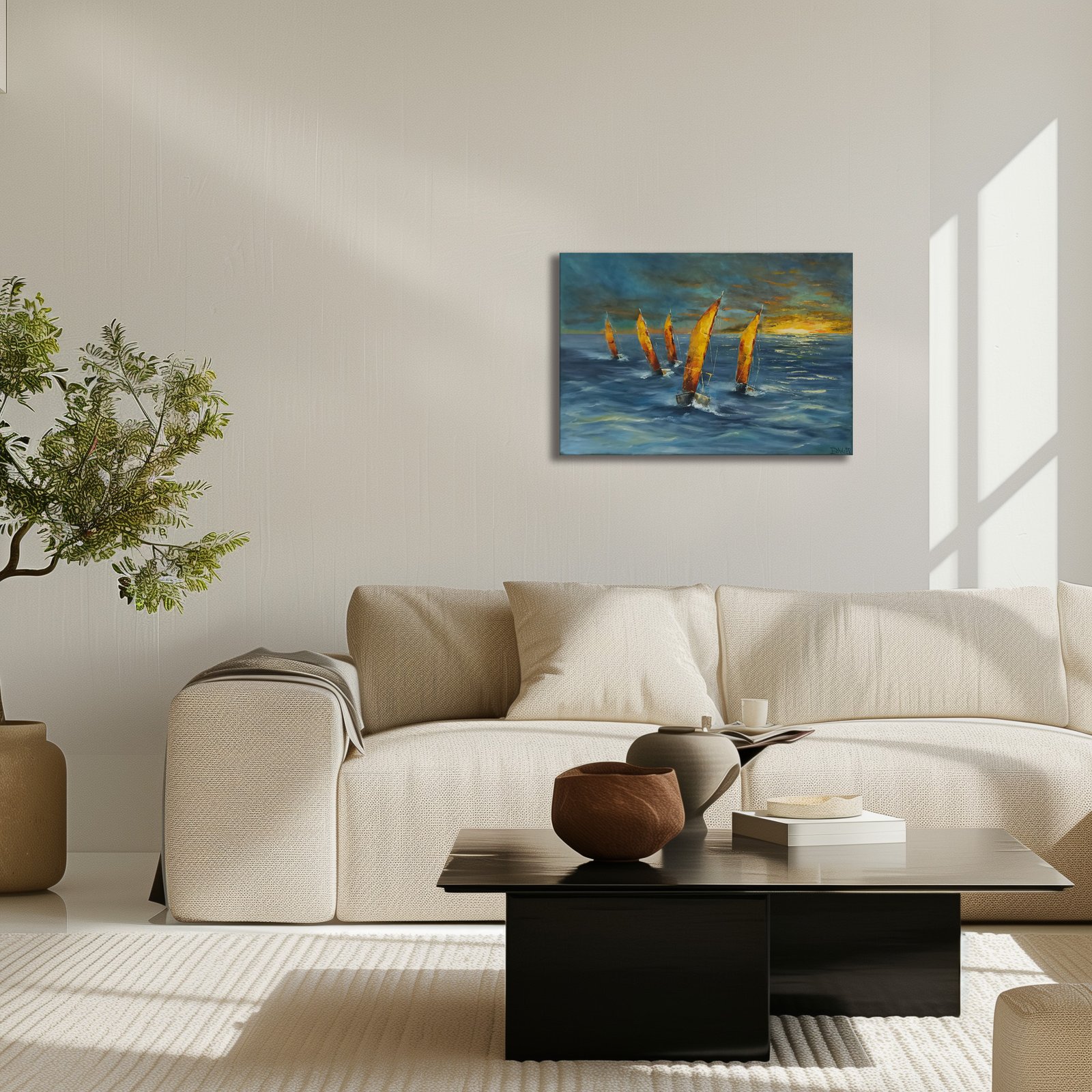 Tapyba ant drobės. Paveikslo „VAKARO REGATA” matmenys 50x70cm, medinis porėmis 1,6cm. Galima kabinti neįrėmintą.