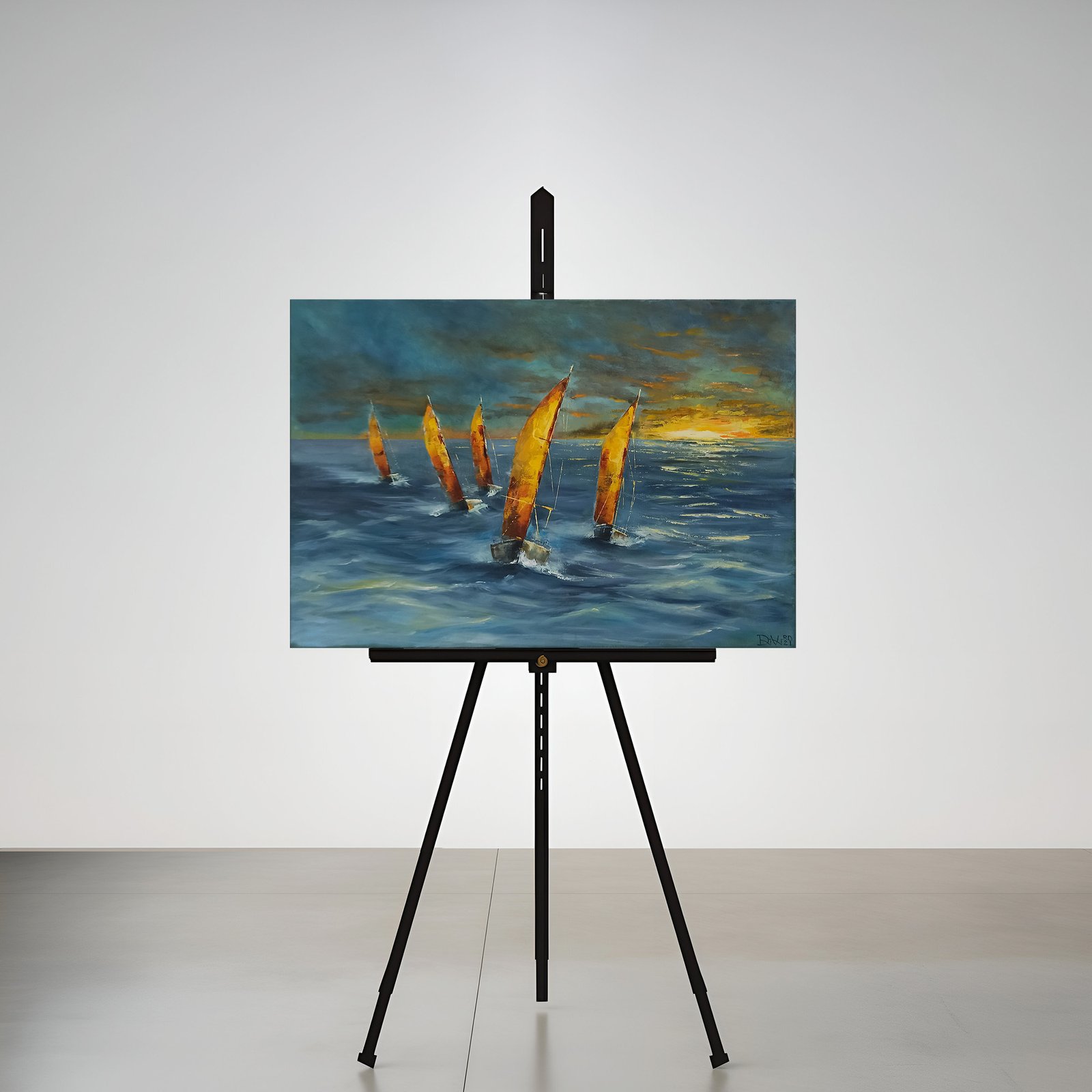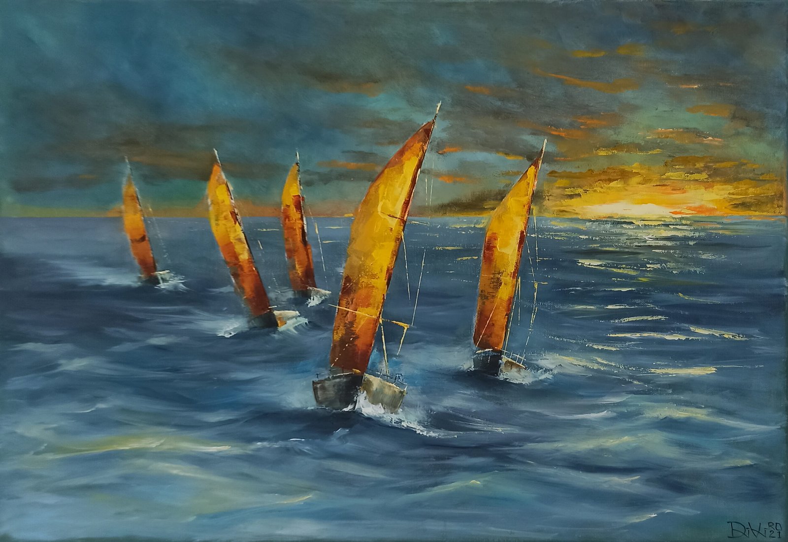 Originalus paveikslas ant drobės. Kūrinyje pavaizduota burlaivių regata. Spalvų sodrumas ir originalios technikos panaudojimas puikia perteikia lengvo vėjo ir greičio nuotaiką. Tai puikus pirkinys ir gera dovana- jūros, nuotykių, sporto, gerų emocijų mėgėjams ir profesionalams.