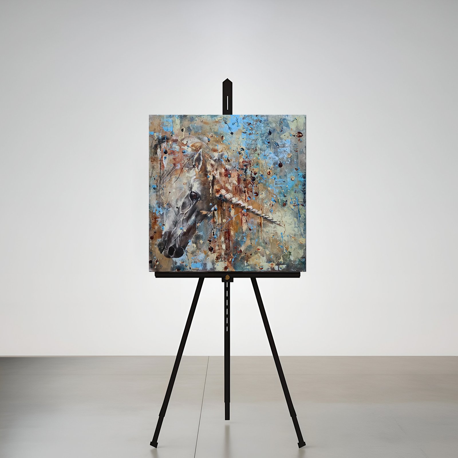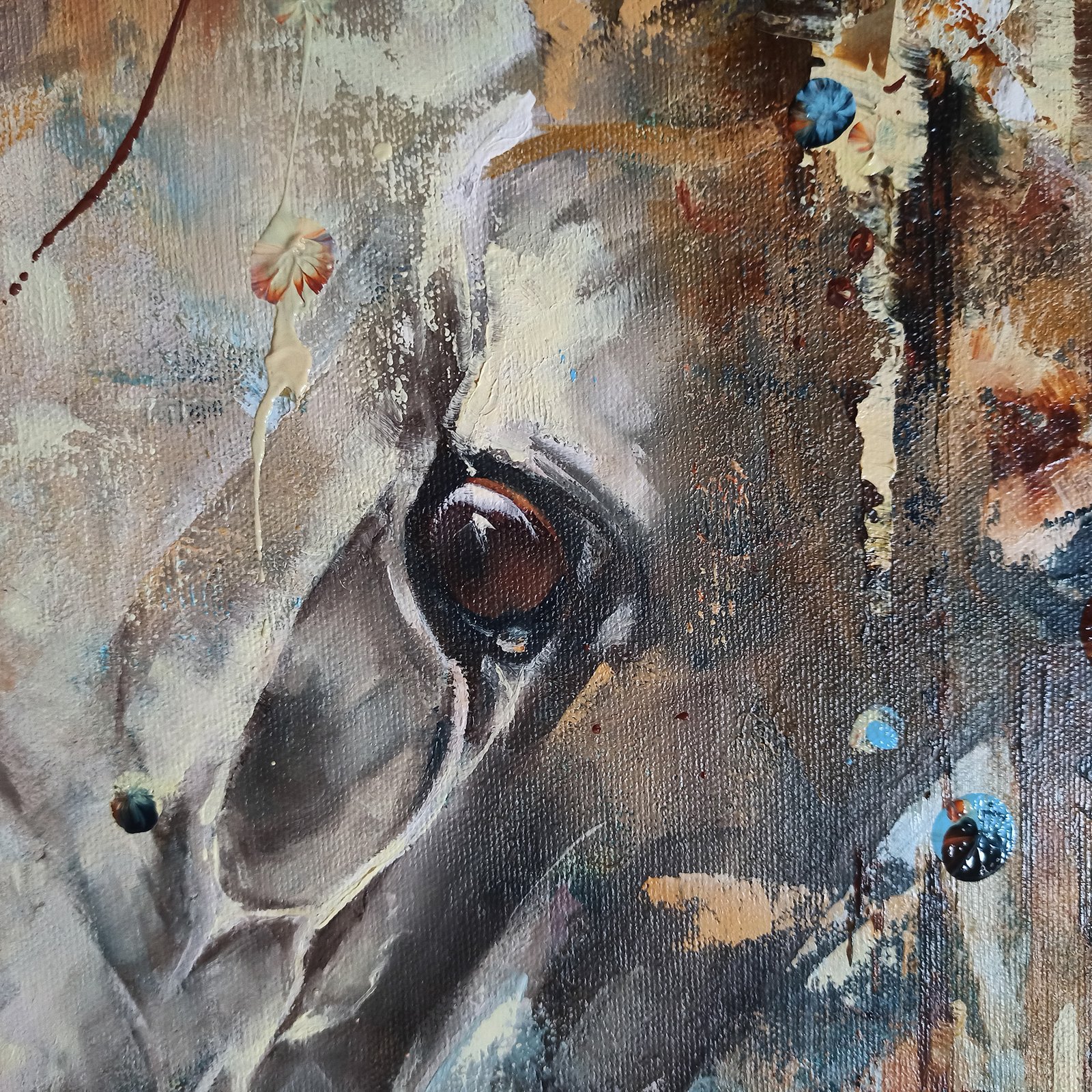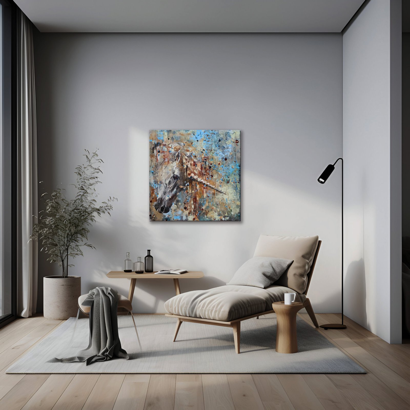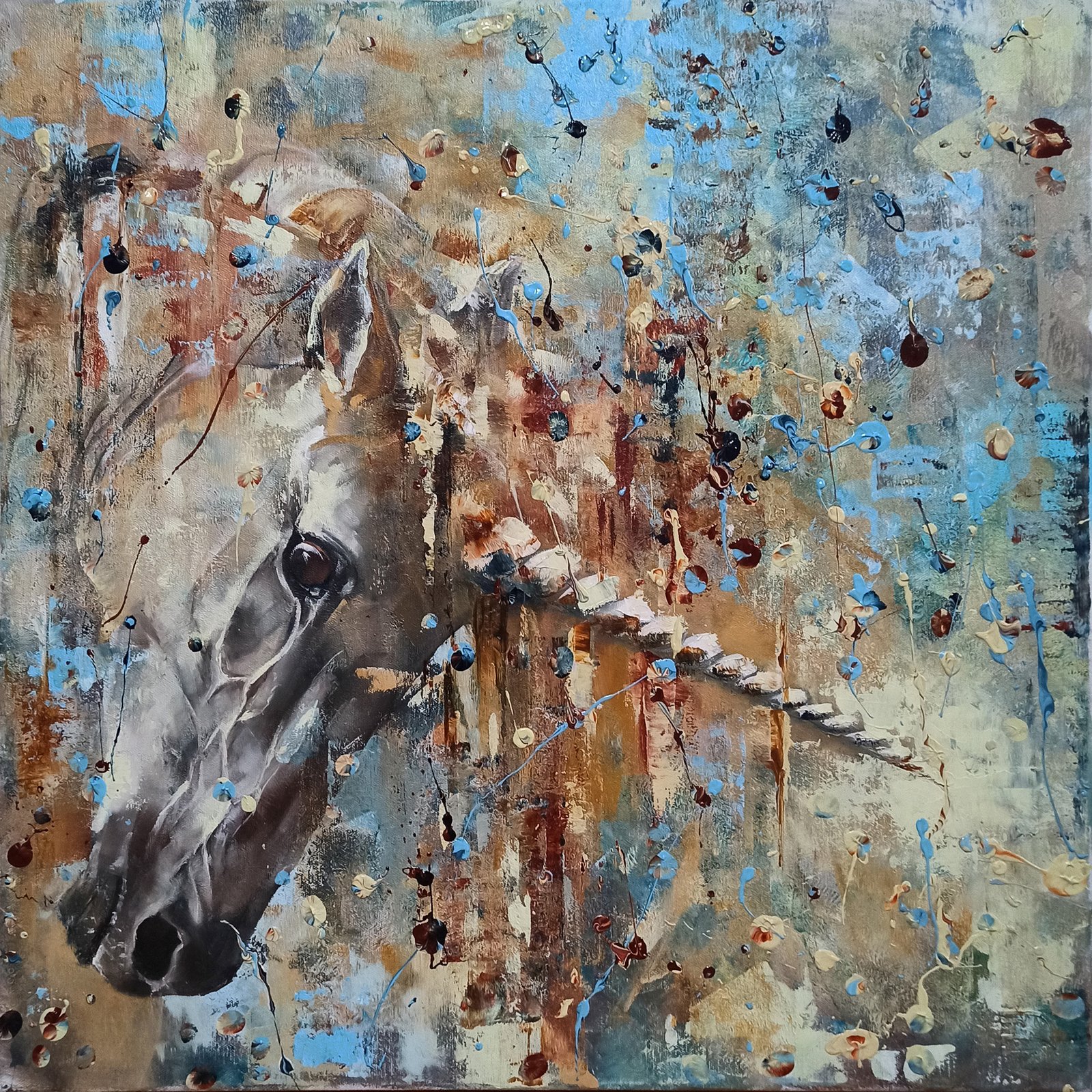 Paveikslas vienaragis „PRISILIETIMAS”. Mtmenys 60cm/60cm/2,0 cm, medinis porėmis. Mišri technika: akrilas, aliejus. Šis paveikslas puikiai tiks papuošti svetainę, valgomąjį, miegamąjį, ofisą, sveikatingumo ar sporto salę.