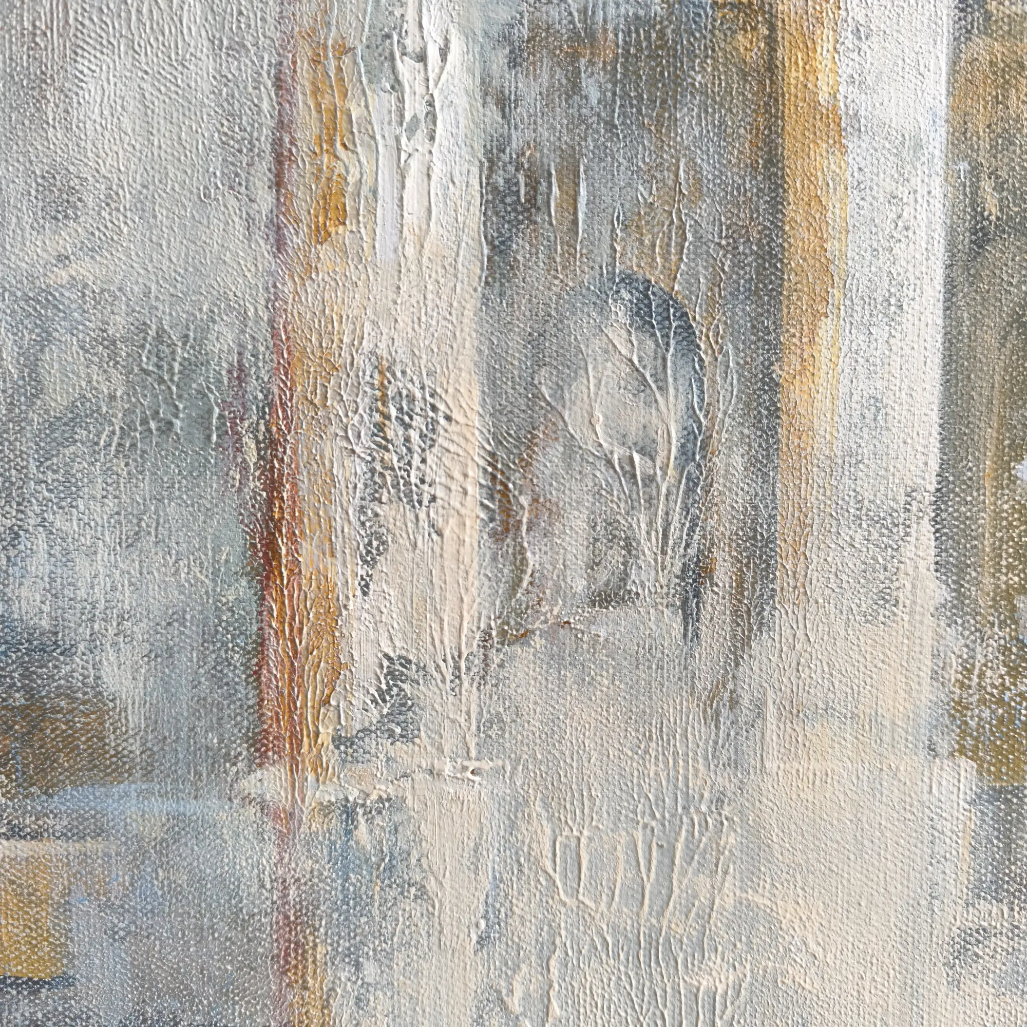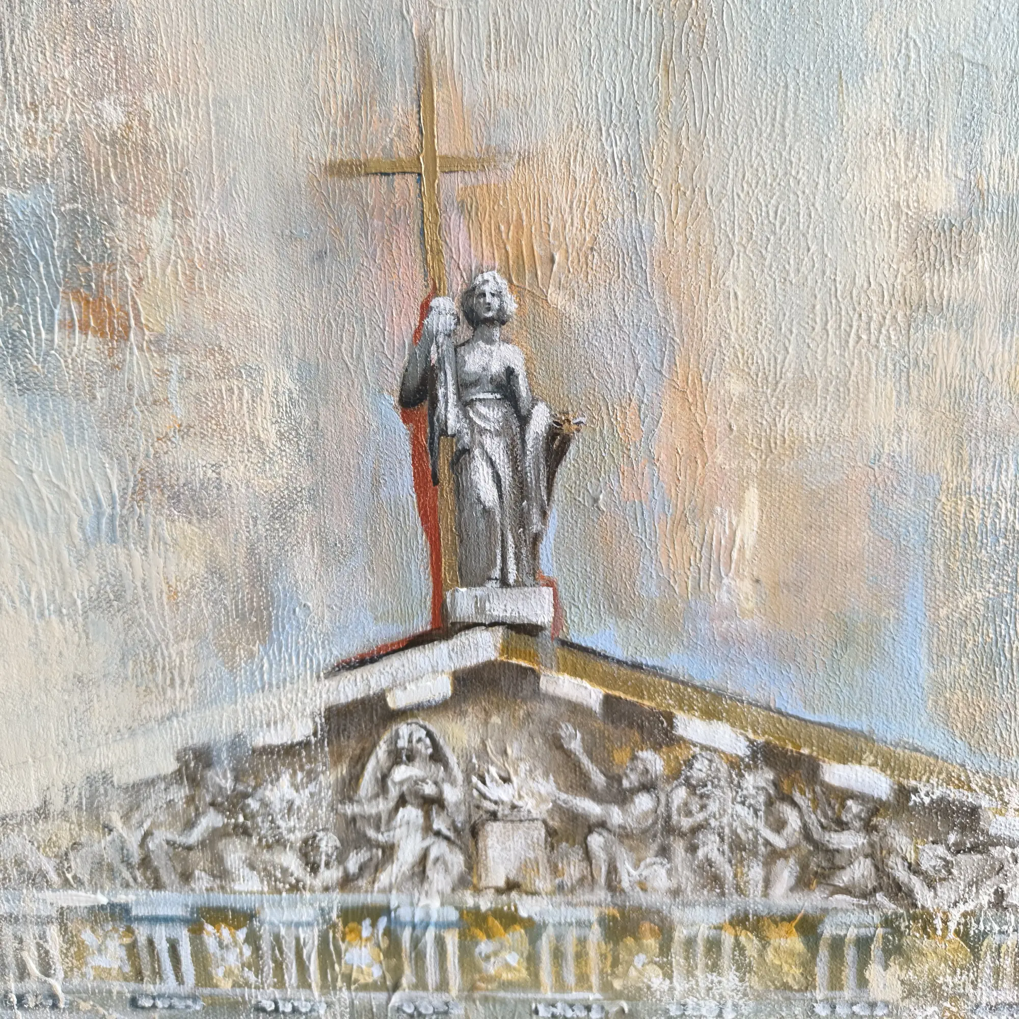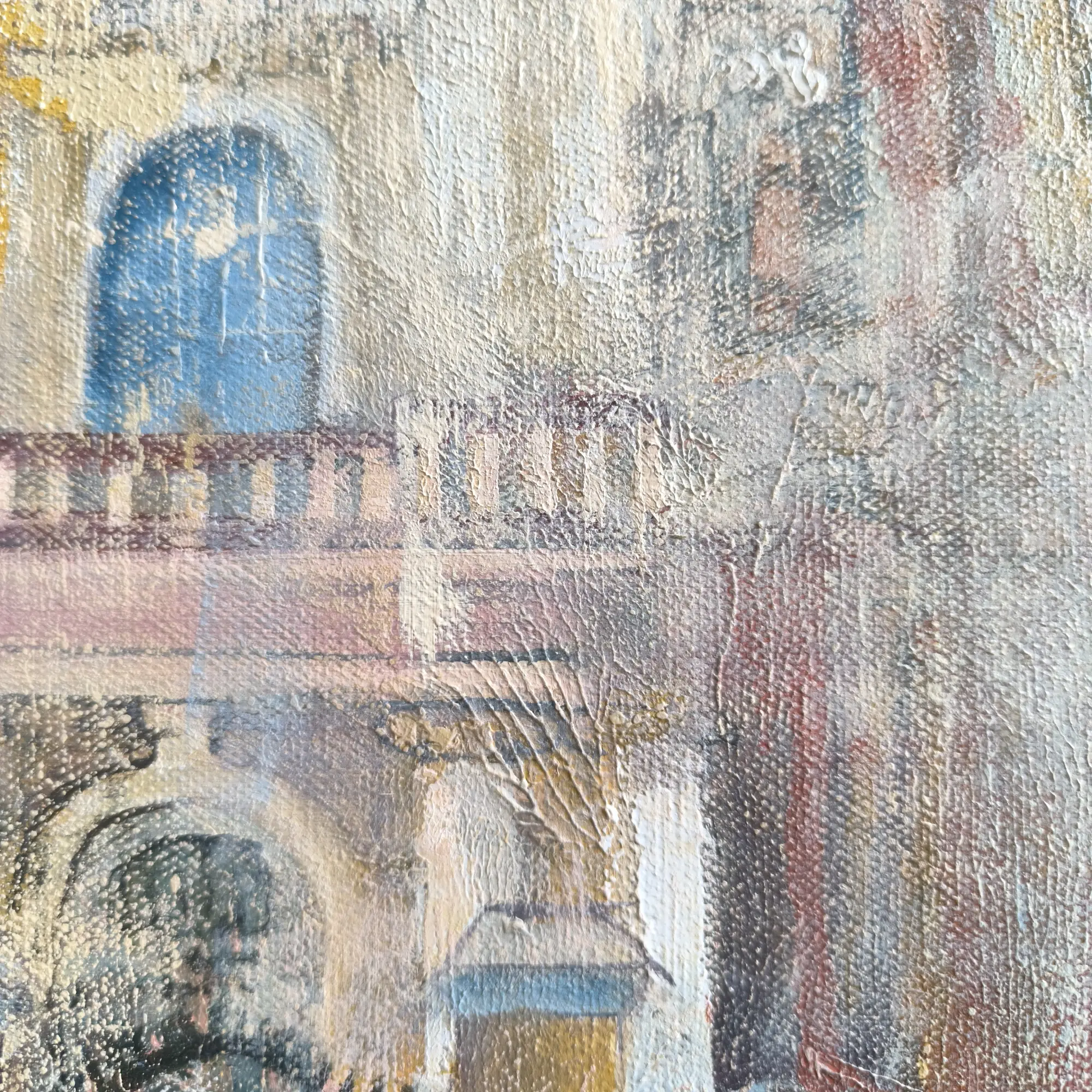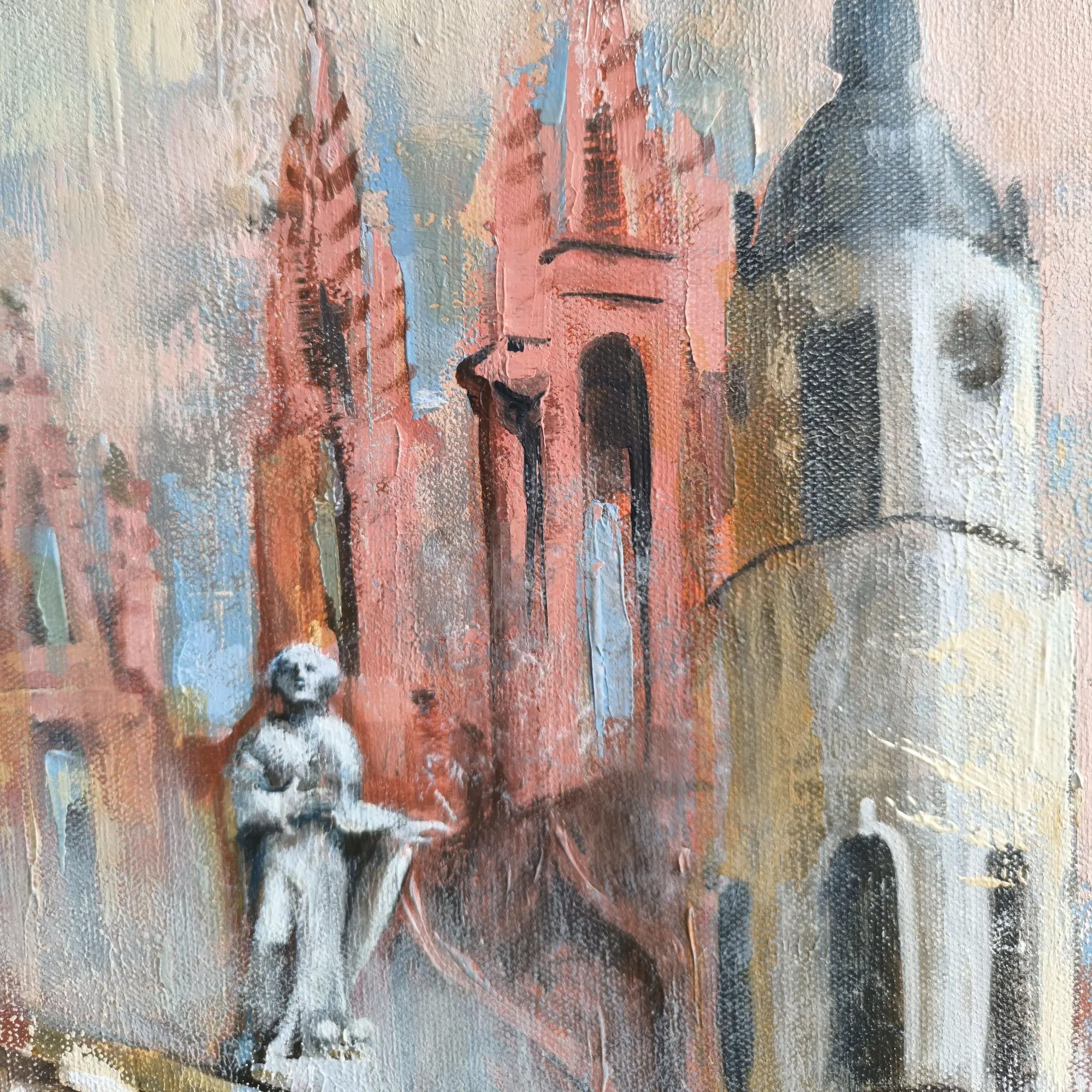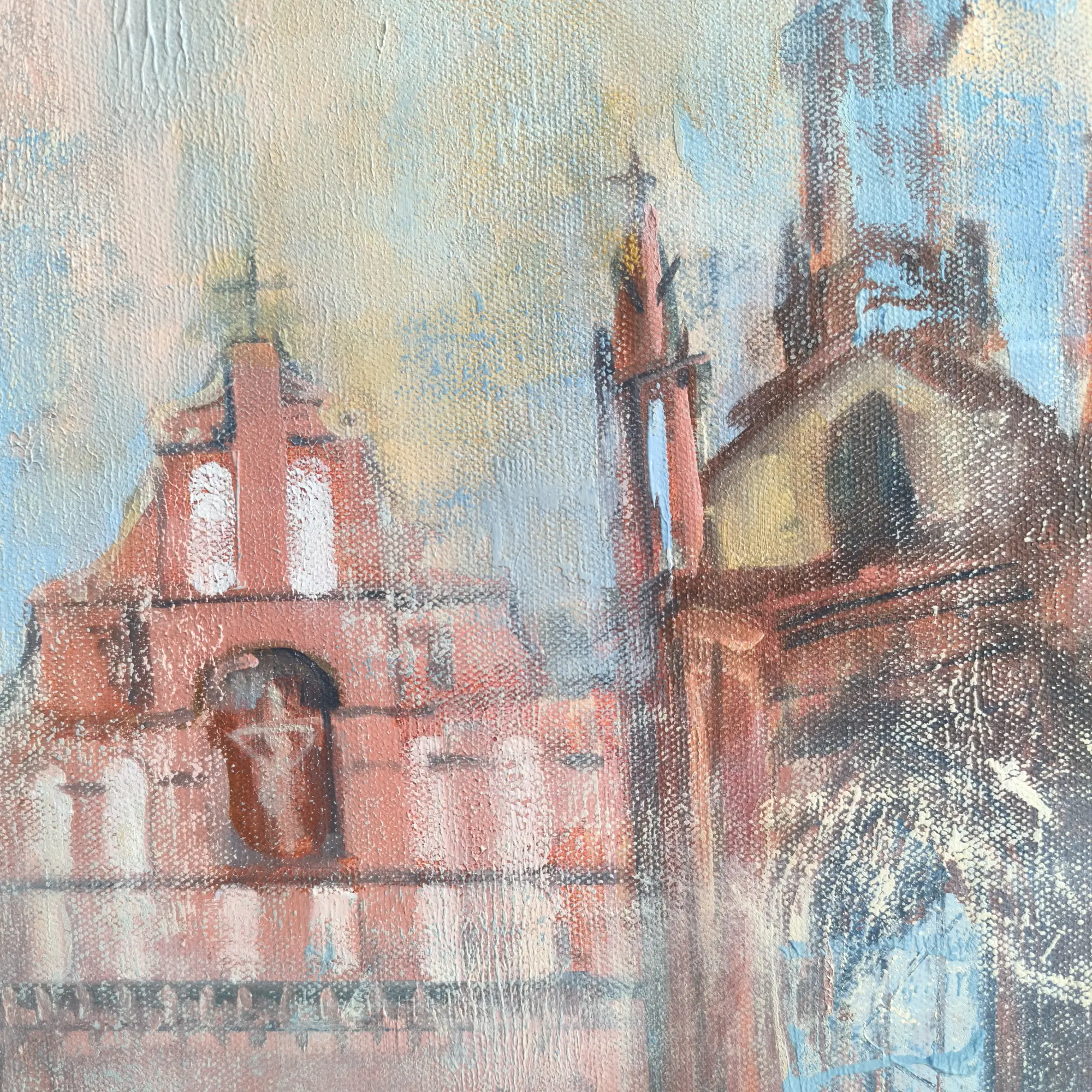 Miglotas ir paslaptingas fonas sukuria laiko tėkmės pojūtį, tarsi šios istorinės vietos išnyra iš praeities ir susijungia viename vaizde. Detalės perteikiamos subtiliais akrilo ir aliejaus potėpiais, suteikiant kūriniui tekstūros ir gilumo.