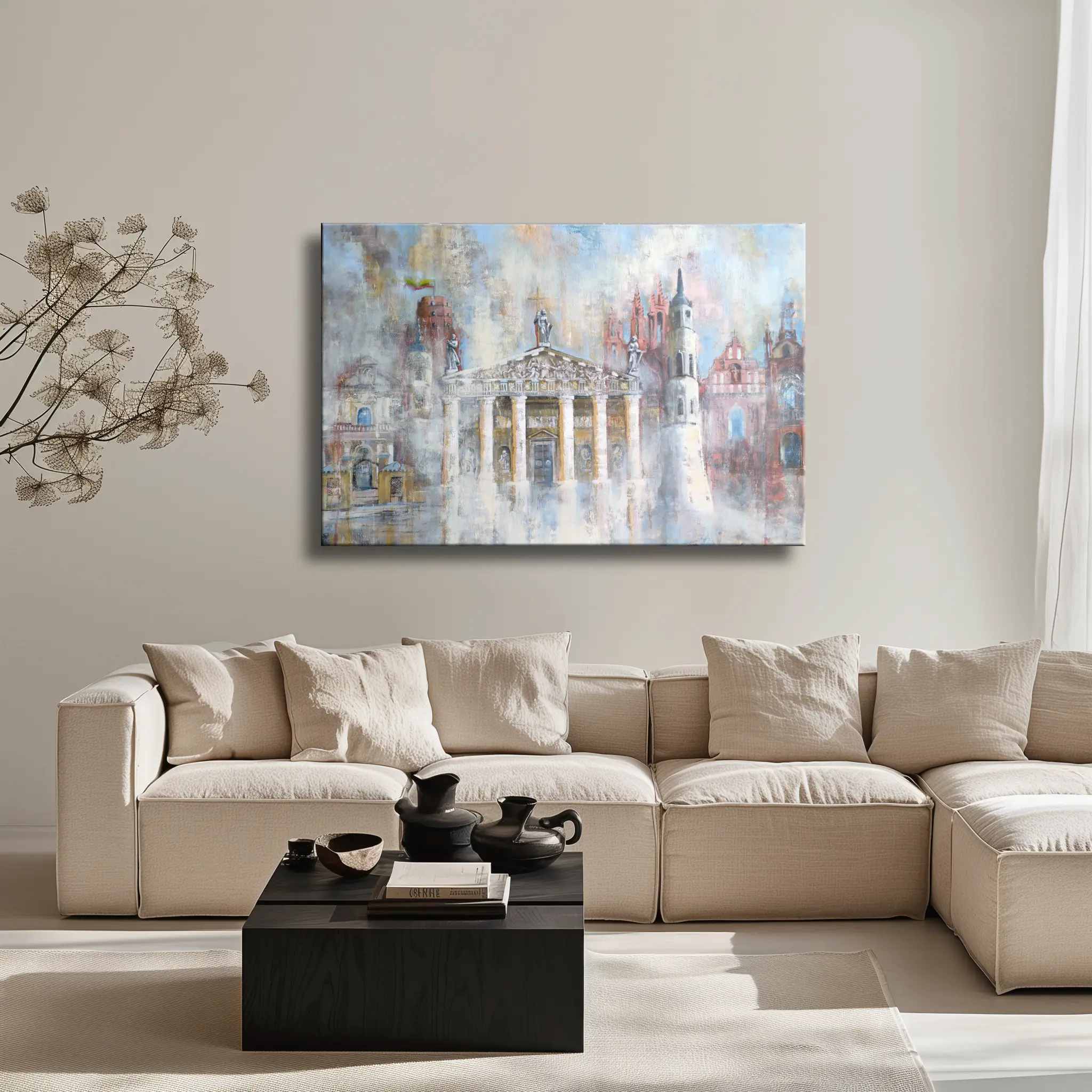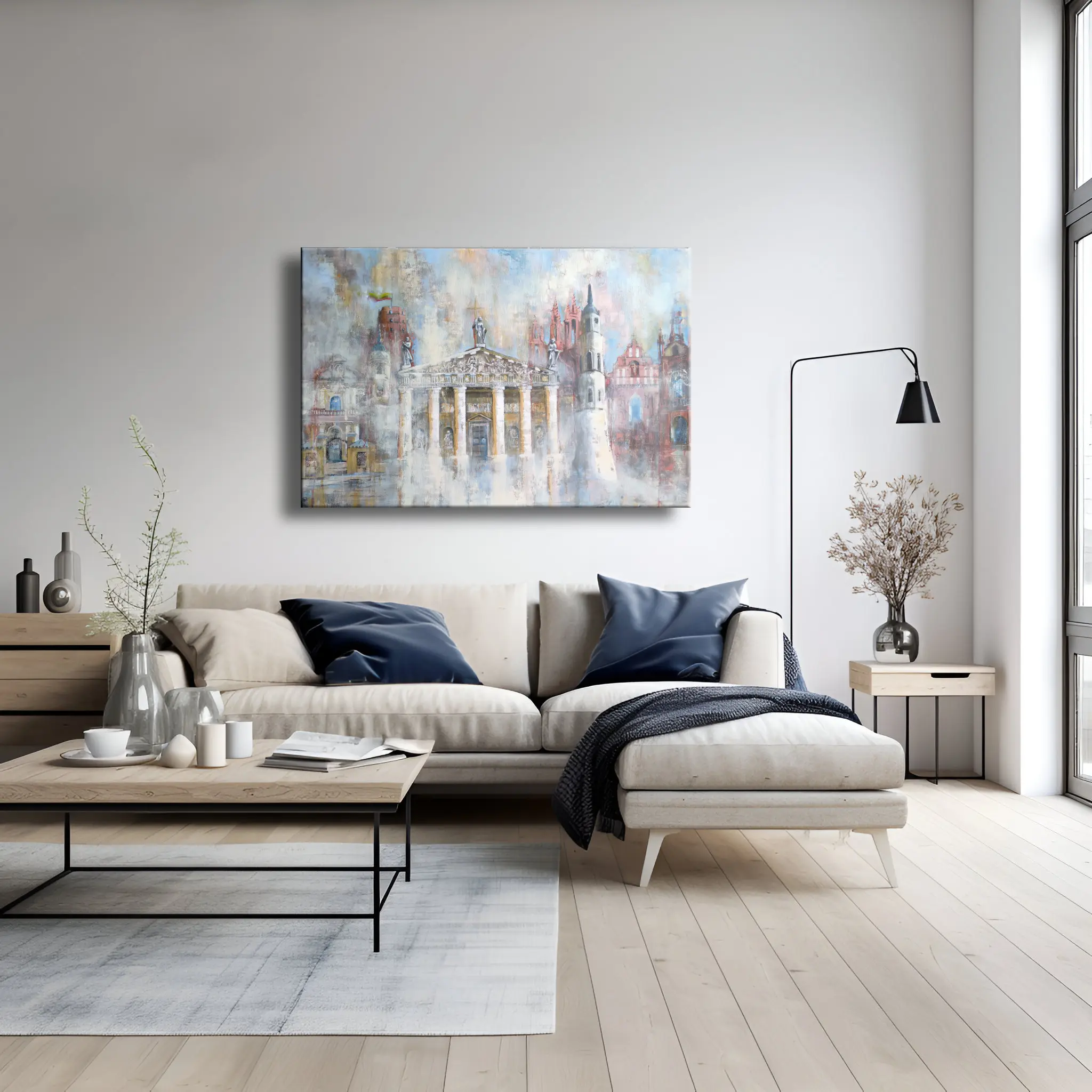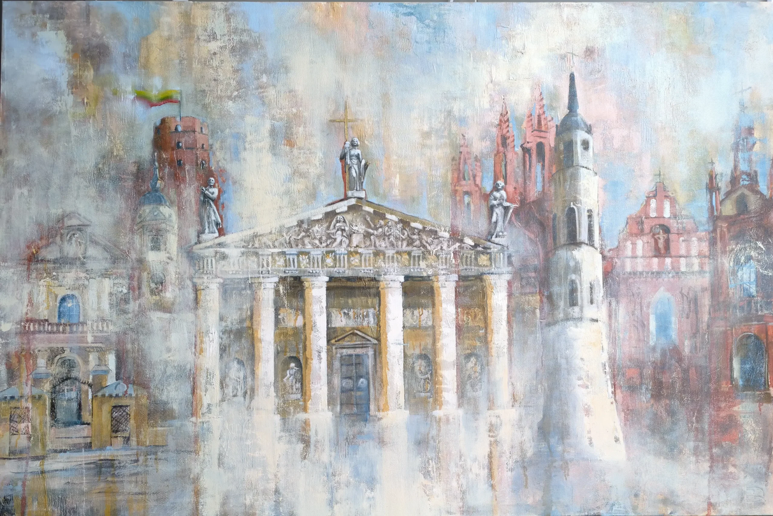 Šis įspūdingas paveikslas atskleidžia Vilniaus architektūros grožį ir istoriją, jungdamas miesto simbolius į vieną harmoningą kompoziciją. Kūrinys vaizduoja didingą Vilniaus katedrą, gotiškąją Šv. Onos bažnyčią, iškilmingą Šv. Petro ir Povilo bažnyčią bei istorinę Gedimino pilį su plazdančia Lietuvos vėliava.