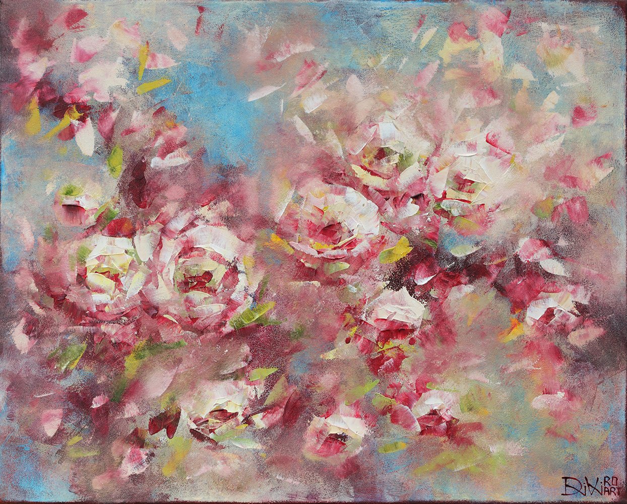 Daivos Rožukienės paveikslas „RYTO BIJŪNAI” yra mišrios technikos kūrinys, sukurtas akriliniais / aliejiniais dažais.