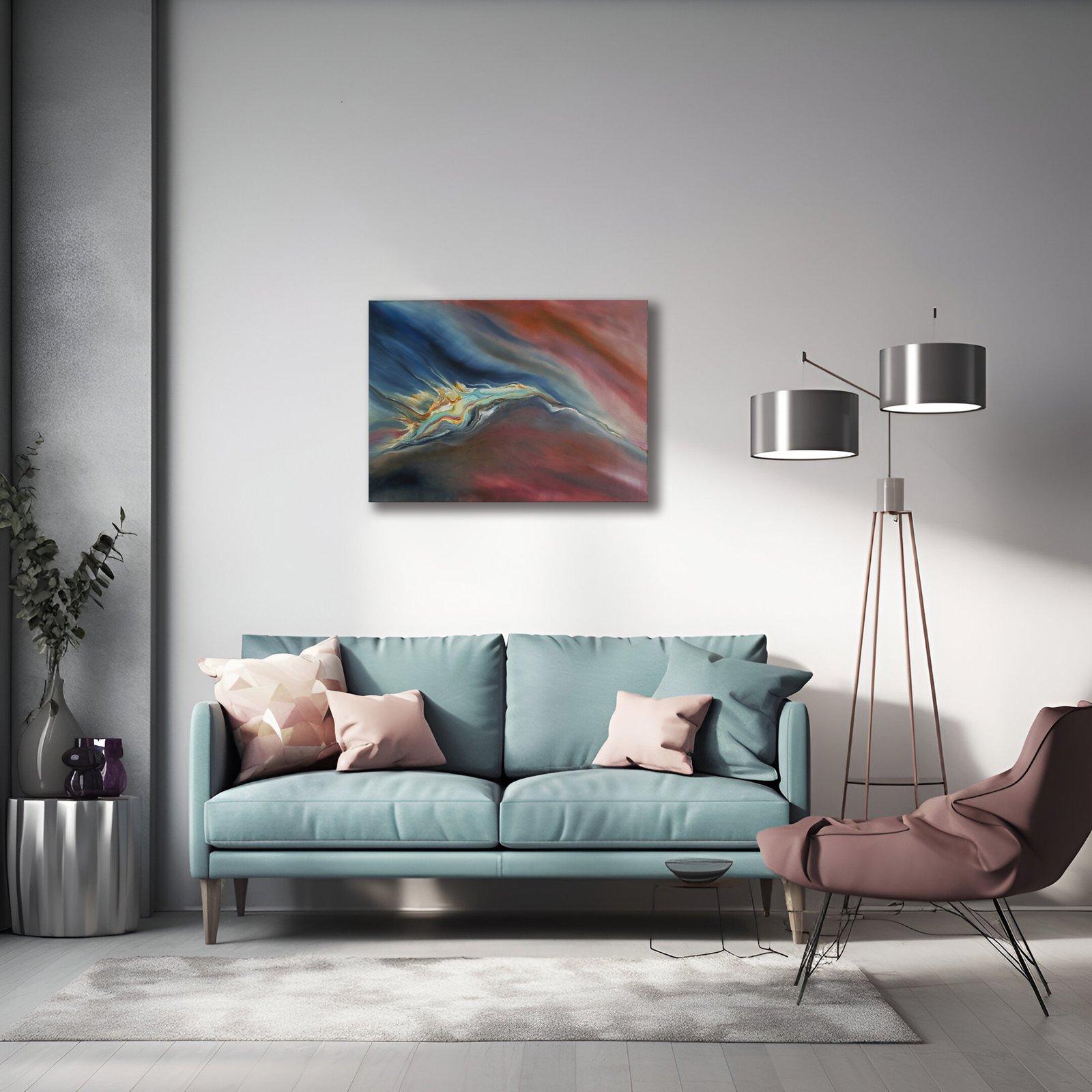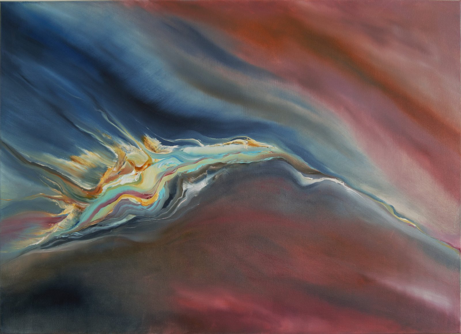 Šiuolaikinis, abstraktus paveikslas ant drobės. Daivos Rožukienės paveikslas „PABUDIMAS” yra mišrios technikos kūrinys, sukurtas akriliniais / aliejiniais dažais.