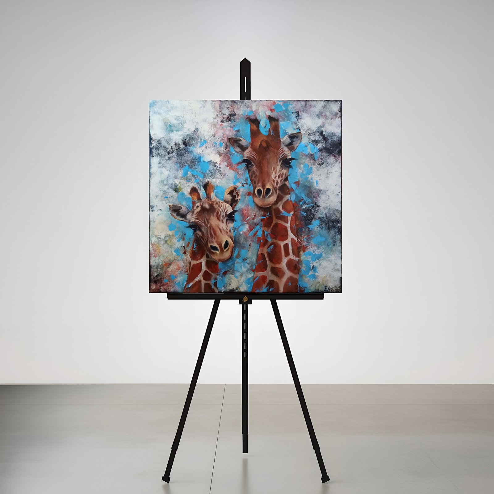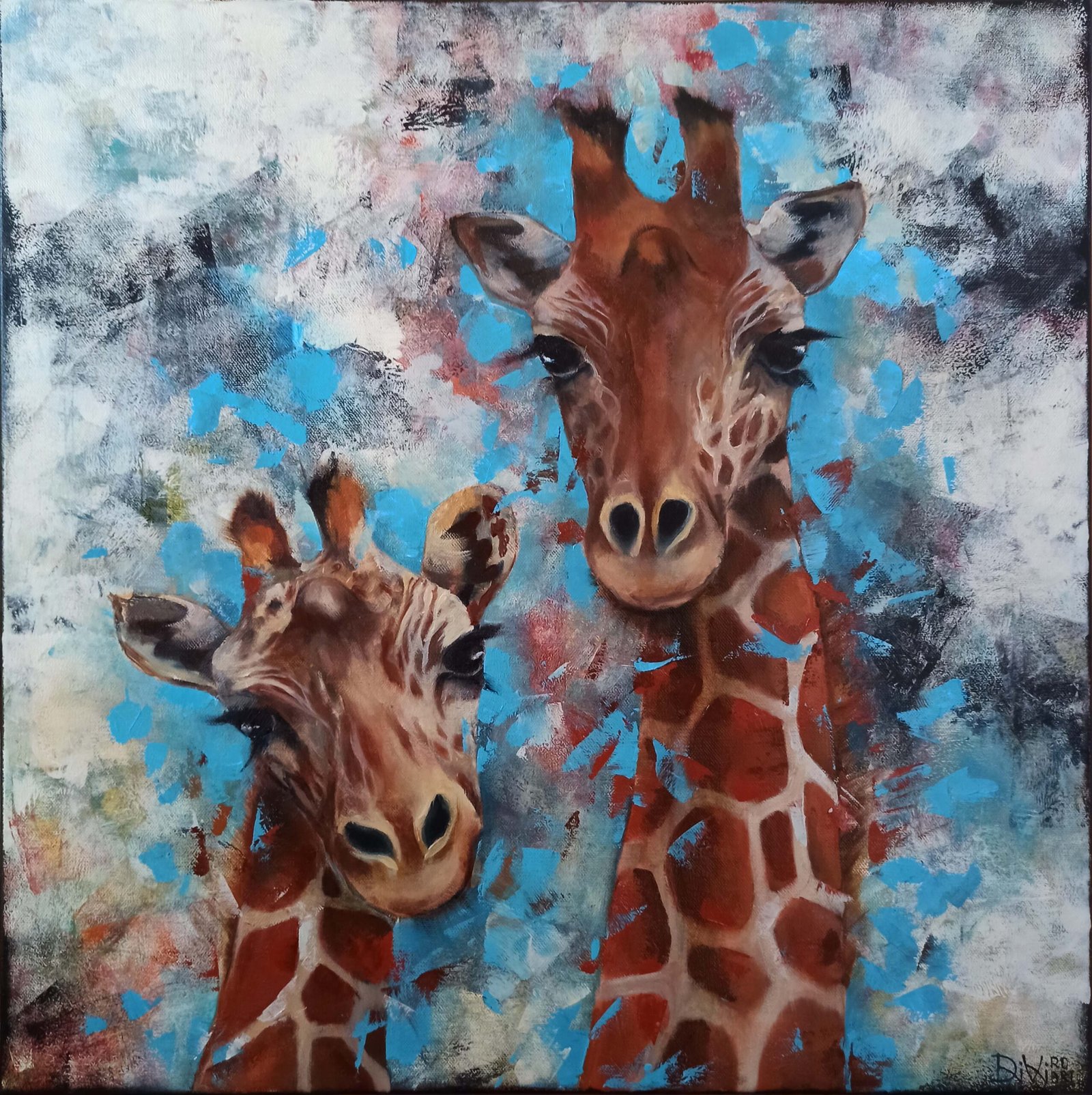 Paveikslas su žirafosm „DVI KEISTOS GRAŽUOLĖS”. Aliejus/drobė, matmenys 60x60cm, porėmio storis (1,6cm), neįrėmintas. Paveikslą taip pat galima įsigyti platformoje paveikslai.lt.