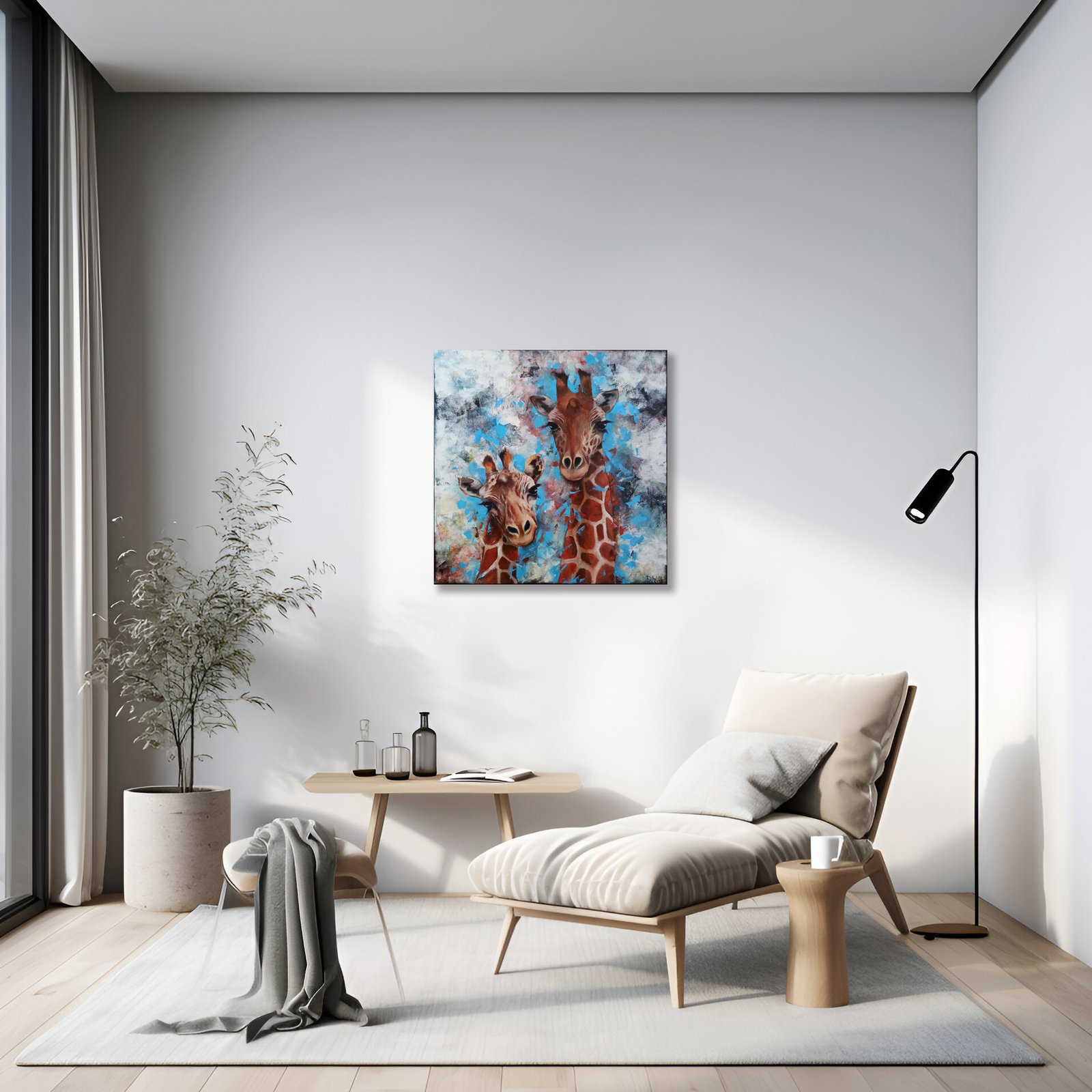 Nuotaikingas, spalvingas paveikslas su žirafomis „DVI KEISTOS GRAŽUOLĖS” puikiai tiks papuošti tiek  namų, tiek ofiso ar grožio salono interjerą.